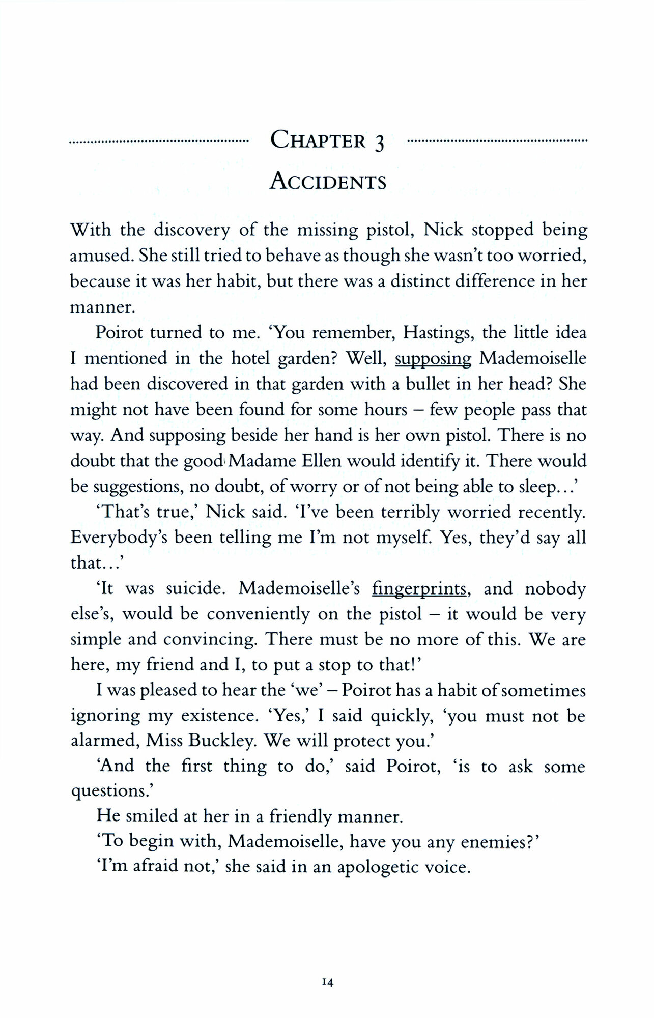 Hercule Poirot, the famous detective, is on holiday in the south of England when he meets a lady called Nick Buckley. Nick has had a lot of mysterious ‘accidents’. First, her car brakes failed. Then, a large rock just missed her when she was walking, and later, a painting almost fell on her while she was asleep. Finally, Poirot finds a bullet hole in her hat! Nick is in danger and needs Poirot’s help. Can he find the guilty person before Nick is harmed?
