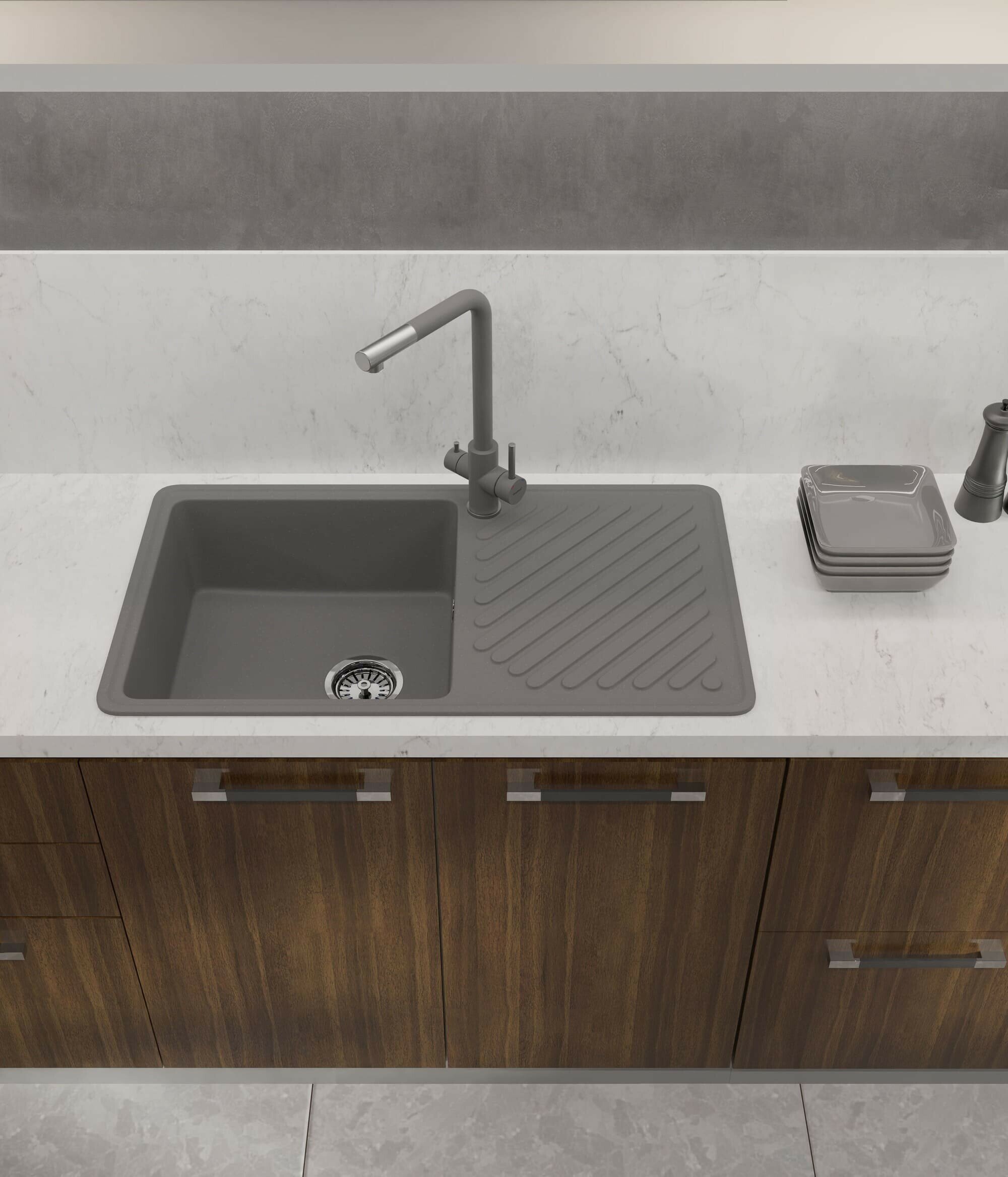 GRANFEST Мойка QUARZ 53 1-чаша+крыло 860*480мм темно-серый арт.GF-ZL- Мойки для кухни GranFest Quarz – это простые и лаконичные модели, которые идеально впишутся в помещение практически в любом стиле – начиная от классики и заканчивая лофтом. Цветовая палитра включает в себя спокойные оттенки, напоминающие о природе и привносящие в пространство ощущение гармонии. Тренд на натуральность поддерживает и легкая текстура камня. Мойки для кухни GranFest Quarz сочетают в себе высокое качество и прекрасные потребительские характеристики: - ударопрочность; - устойчивость к царапинам; - отсутствие пористости; - устойчивость к воздействию высоких температур (мойки выдерживают перепады температур от -40 до +242 C); - антибактериальные свойства (на поверхности мойки не размножаются бактерии); - гидрофобность; - защиту от воздействия красящих веществ. Несмотря на свою компактность, мойки для кухни GranFest Quarz имеют достаточно глубокую чашу. В ней удобно мыть формы для запекания, кастрюли и даже большие сковороды. Модели оснащены площадкой под смеситель и аксессуары. В качестве материала изготовления используется кварцевый композит, обеспечивающий повышенную прочность и долговечность моек.