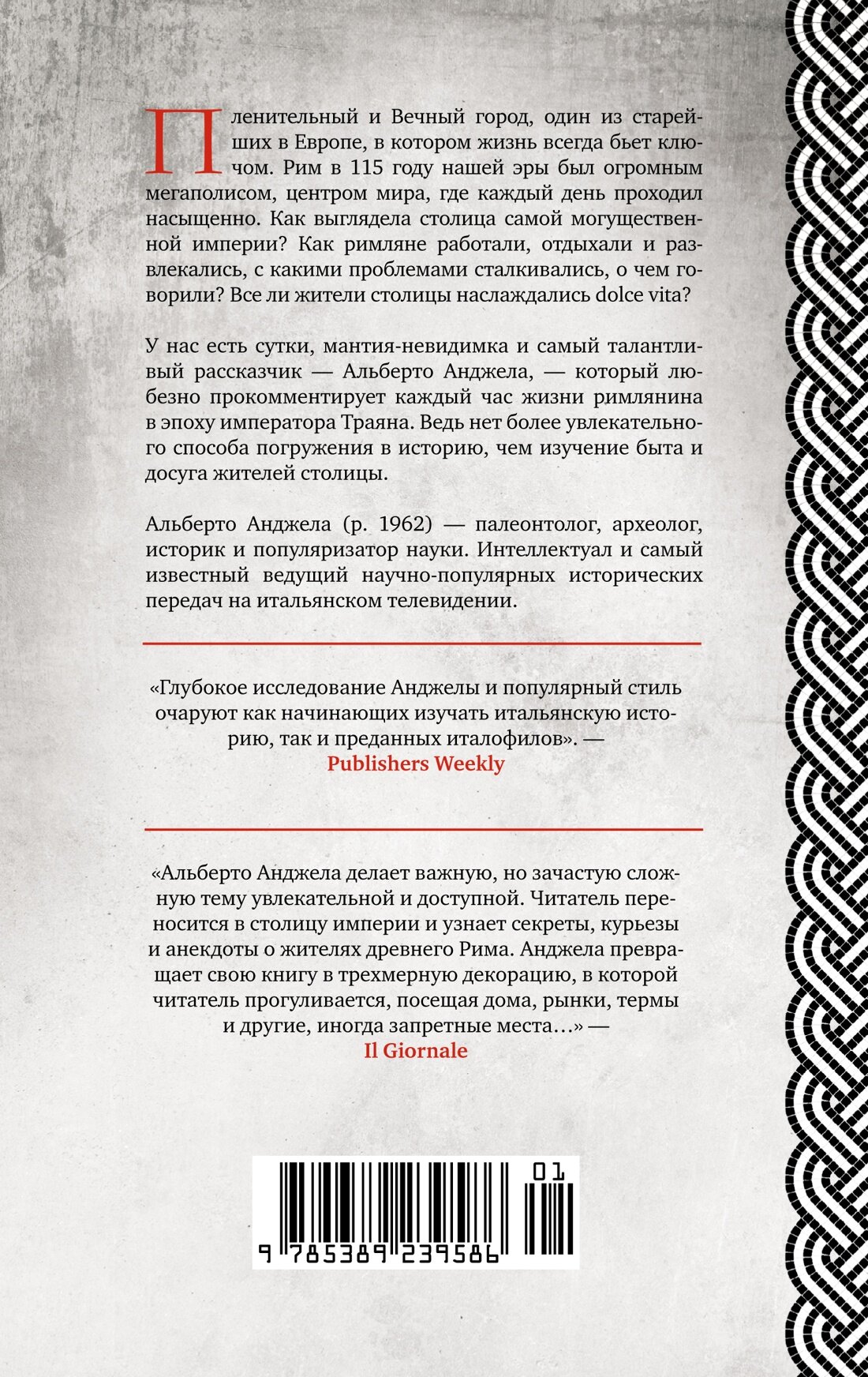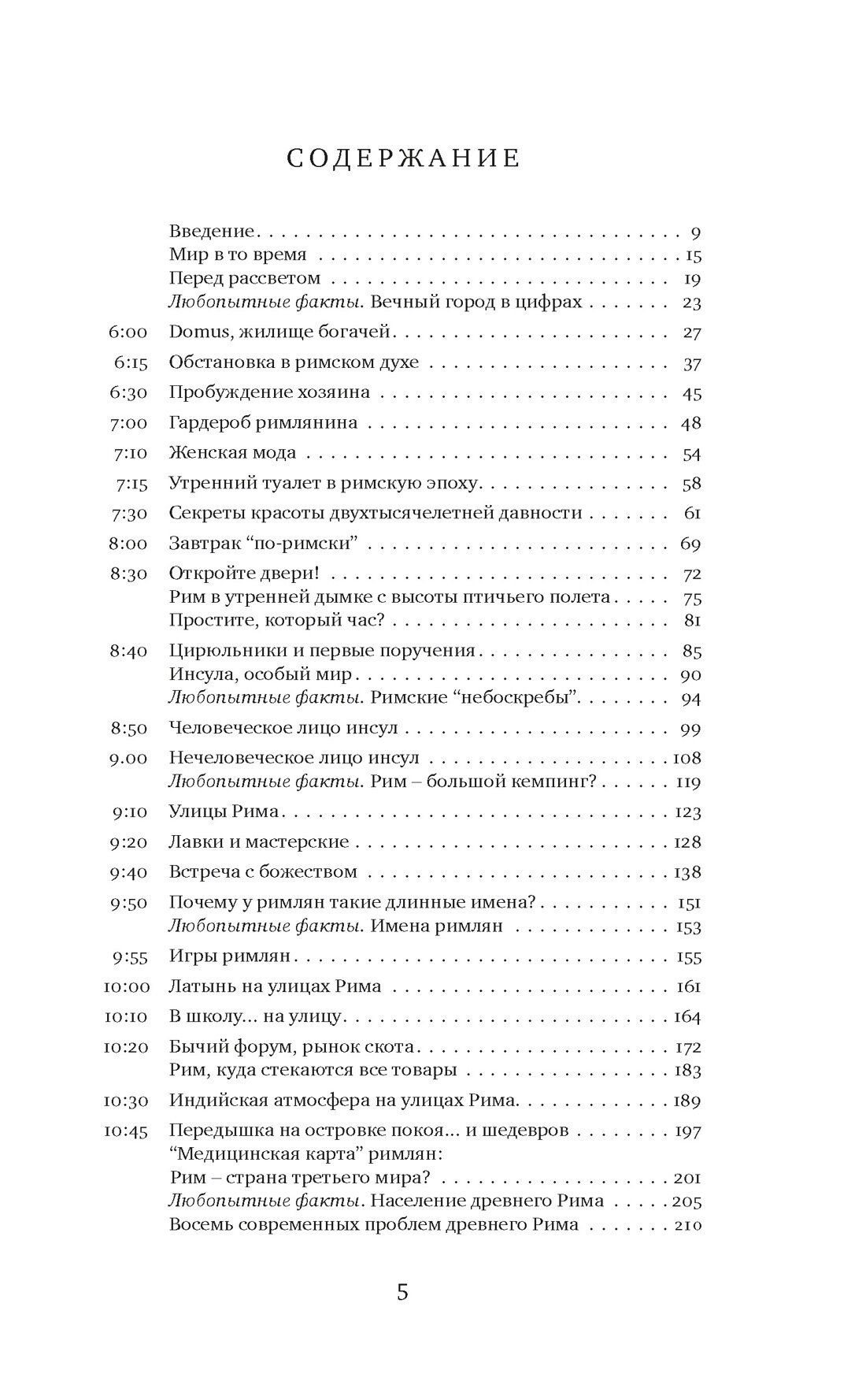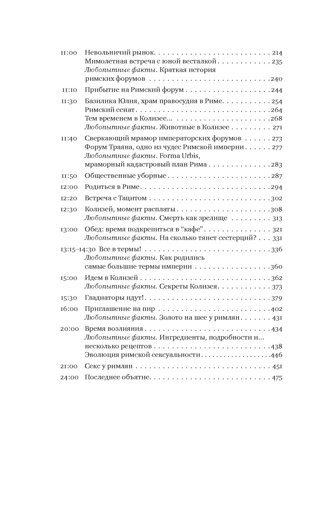 Автор предлагает нам “накрыться шапкой-невидимкой” и провести в Риме целый день, от рассвета до заката, в 115 году нашей эры: потолкаться на людной улице и заглянуть в Колизей, посетить судебное слушание и роскошные термы, отведать изысканных блюд и насладиться беседой на званом ужине. И закончить день на любовном ложе — здесь тоже за две тысячи лет ничего не изменилось.