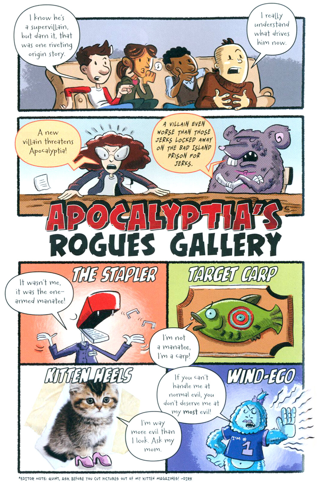 Our heroes have but one choice: continue Z-Man’s legacy by writing and illustrating THEIR OWN COMIC BOOK! Step one? Knock off their beloved Z-Man and cast themselves as super rad, super goofy, superhero protectors of the mysterious city of Apocalyptia. What could possibly go wrong? Just about everything!