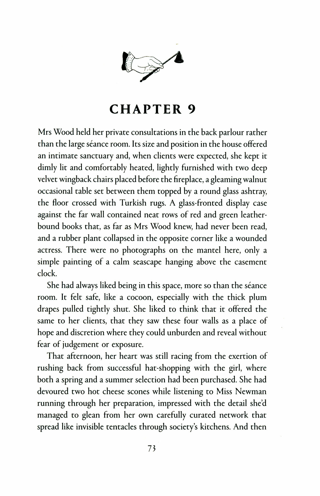 Yet, some of her patrons have recently cancelled their appointments. There are reports of American mediums nearly materialising full spirits and audiences are no longer satisfied with the knocking on tables and candle theatrics of years gone by. And then, at one of Mrs Wood’s routine gatherings, she hears something terrifying – faint, but unmistakable: a yawn.