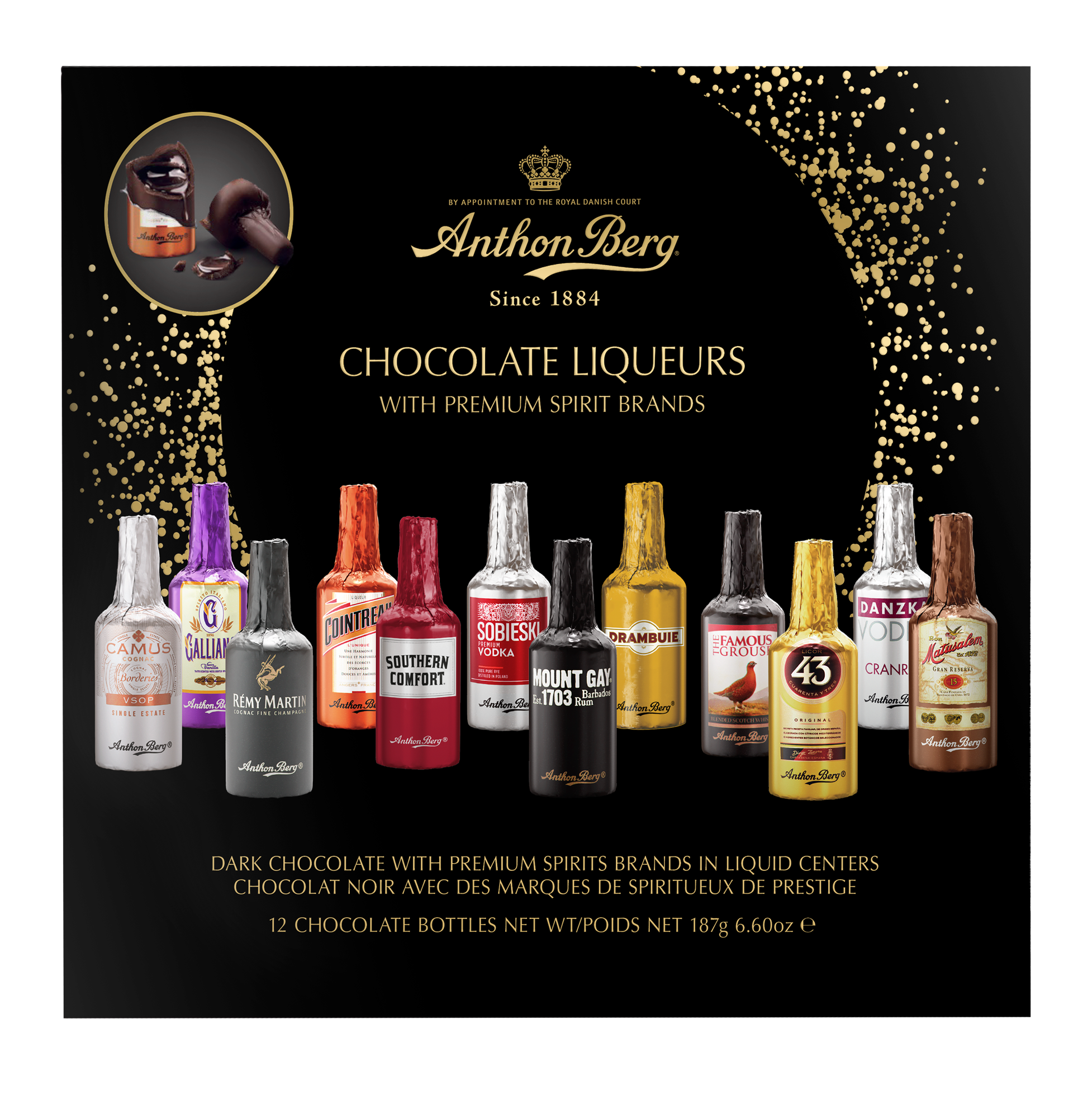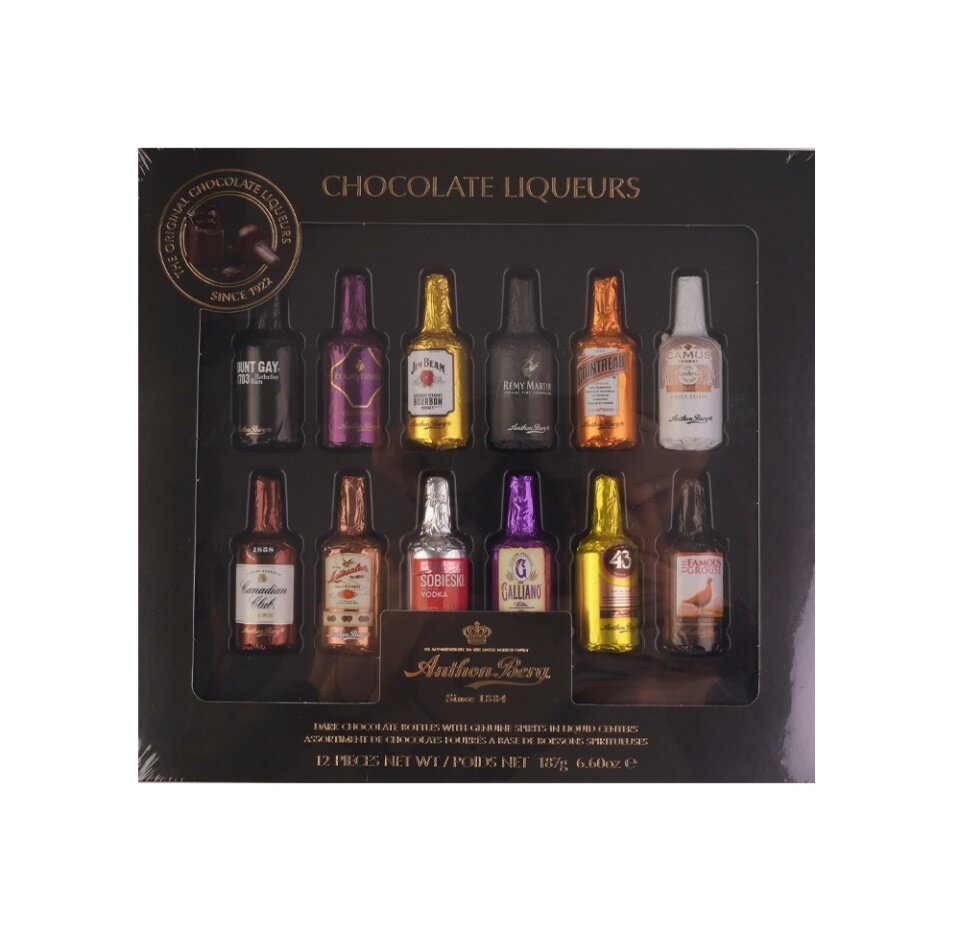 С момента запуска в 1922 году эти всемирно известные шоколадные конфеты в форме бутылок Anthon Berg отправляют потребителей по всему миру в путешествие по самым знаменитым оригинальным маркам ликеров. У этих шоколадных бутылок нет сахарной корки, что подчеркивает превосходный вкус, смешивая тонкий темный шоколад с жидкими ликерами. Ассорти известных оригинальных алкогольных брендов позволит вам насладиться вкусом виски, куантро, водки, коньяка и многих других.