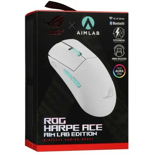 Сверхлегкая беспроводная игровая мышь ROG Harpe Ace Aim Lab Edition весом 54 грамма с проверенным форм-фактором, оптическим датчиком ROG AimPoint с разрешением 36 000 точек на дюйм, беспроводной технологией ROG SpeedNova, трехрежимным подключением, микропереключателями ROG, пятью программируемыми кнопки и функции настройки профиля синергии с помощью оптимизатора настроек Aim Lab.