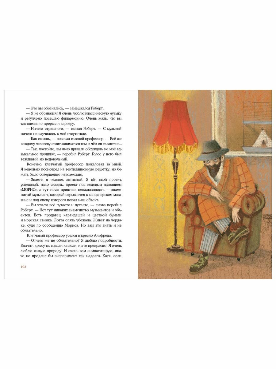 Однажды Морис заметил, что в окно "Кнопки и скрепки" пристально вглядывается незнакомец в клетчатом пальто. А чуть позже Лина рассказала, что в её школе будет читать лекцию заезжий профессор зоологии. Эта новость почему-то ужасно взволновала Мориса, и тут, как назло, Лотта решила сбежать на чердак! Не мог же Морис отпустить её одну! Дальше удивительные события покатились, как снежный ком: путешествие по чердаку, знакомство с летучей мышью Освальдом, таинственное похищение Лотты и главное признание Мориса...