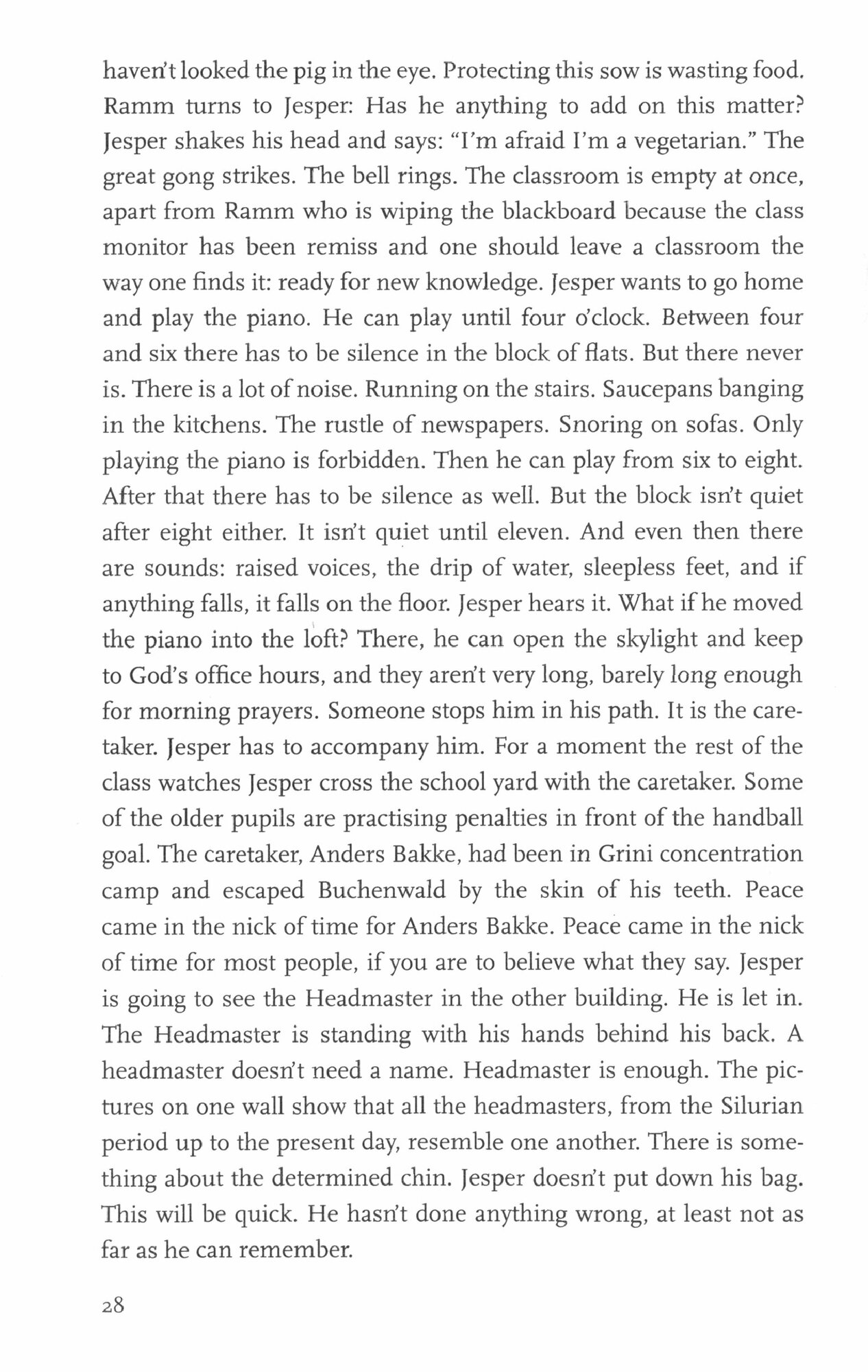 In Kirkeveien, Oslo, in the year 1956, forty-year-old Maj is worn down by being a homemaker and widowed mother. To the indignation of the Red Cross ladies, she cautiously frees herself from the role she has otherwise fulfilled to the letter. She finds a job that she turns out to be more than good at, and some kind of love, too. Her friend Margrethe is sick of her marriage to the antiquarian bookseller, Olaf Hall, but cannot think of divorce. Jesper gets a girlfriend who opens the door to a new, more liberated environment of vegetarianism and politics. And his best friend Jostein realises that his talent for making money will allow him access to a world that is larger and richer than that of the Oslo slaughterhouse.