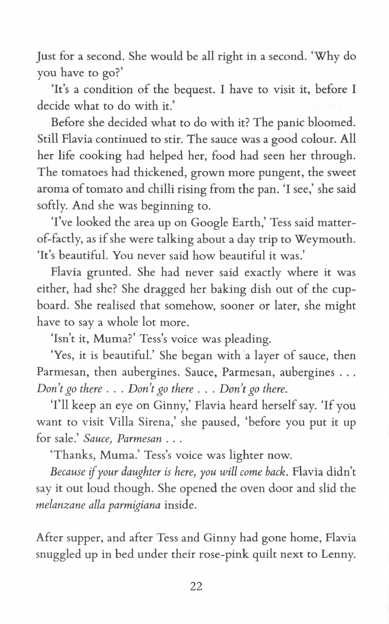 When Tess goes to Sicily, Flavia realises the secrets from her past are about to be revealed and decides to try to explain her actions. Meanwhile, Tess' teenage daughter Ginny is stressed by college, by her blooming sexuality and filled with questions that she longs to ask her father, if only she knew where he was...