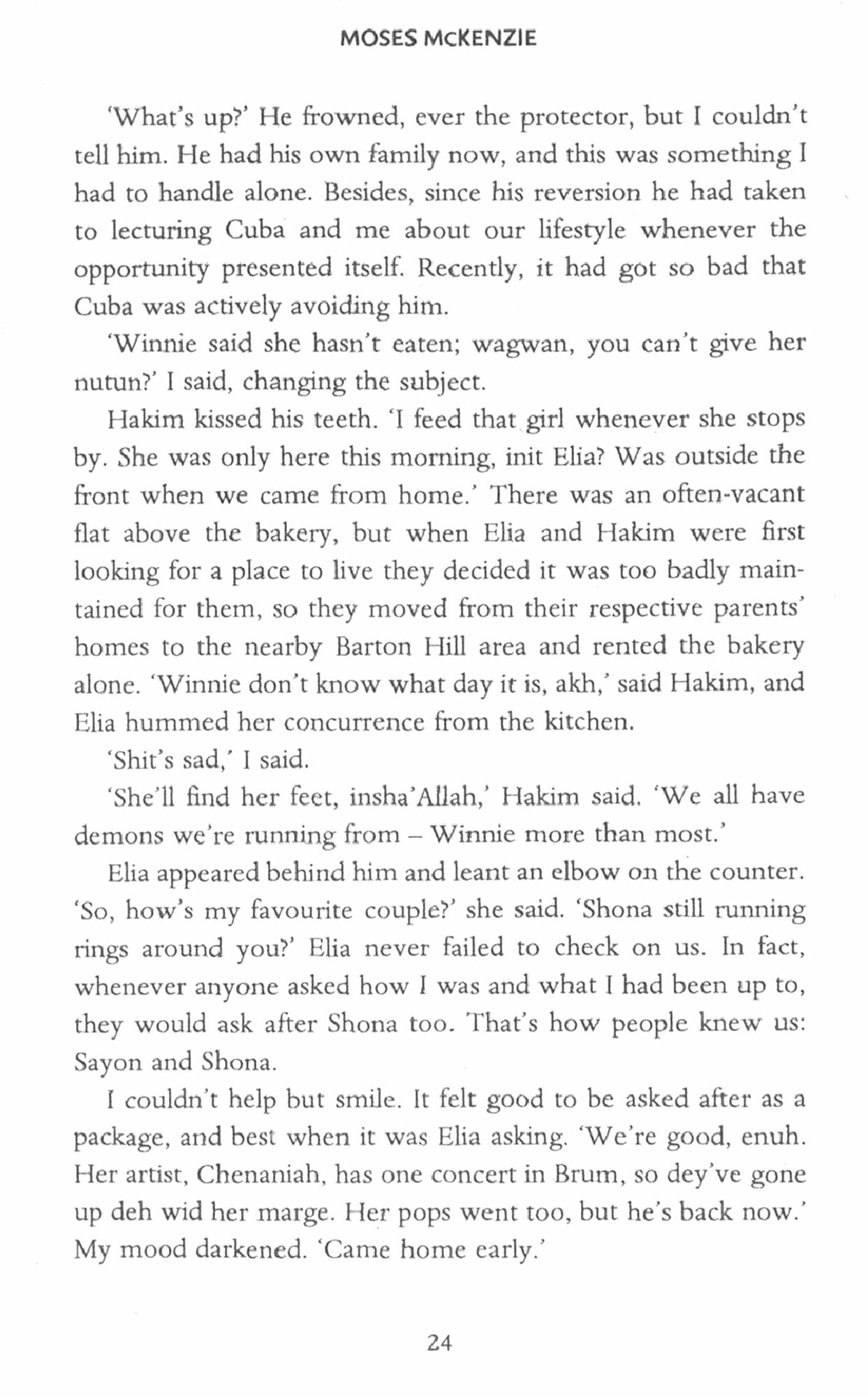 Growing up, Sayon found respite from the chaos of his environment in the love and loyalty of his brother-in-arms, Cuba; in the example of his cousin Hakim, a man once known as the most infamous drug-dealer in their neighbourhood, now a proselytising Muslim; and in the tenderness of his girl, Shona, whose own sense of purpose galvanises Sayon's.
