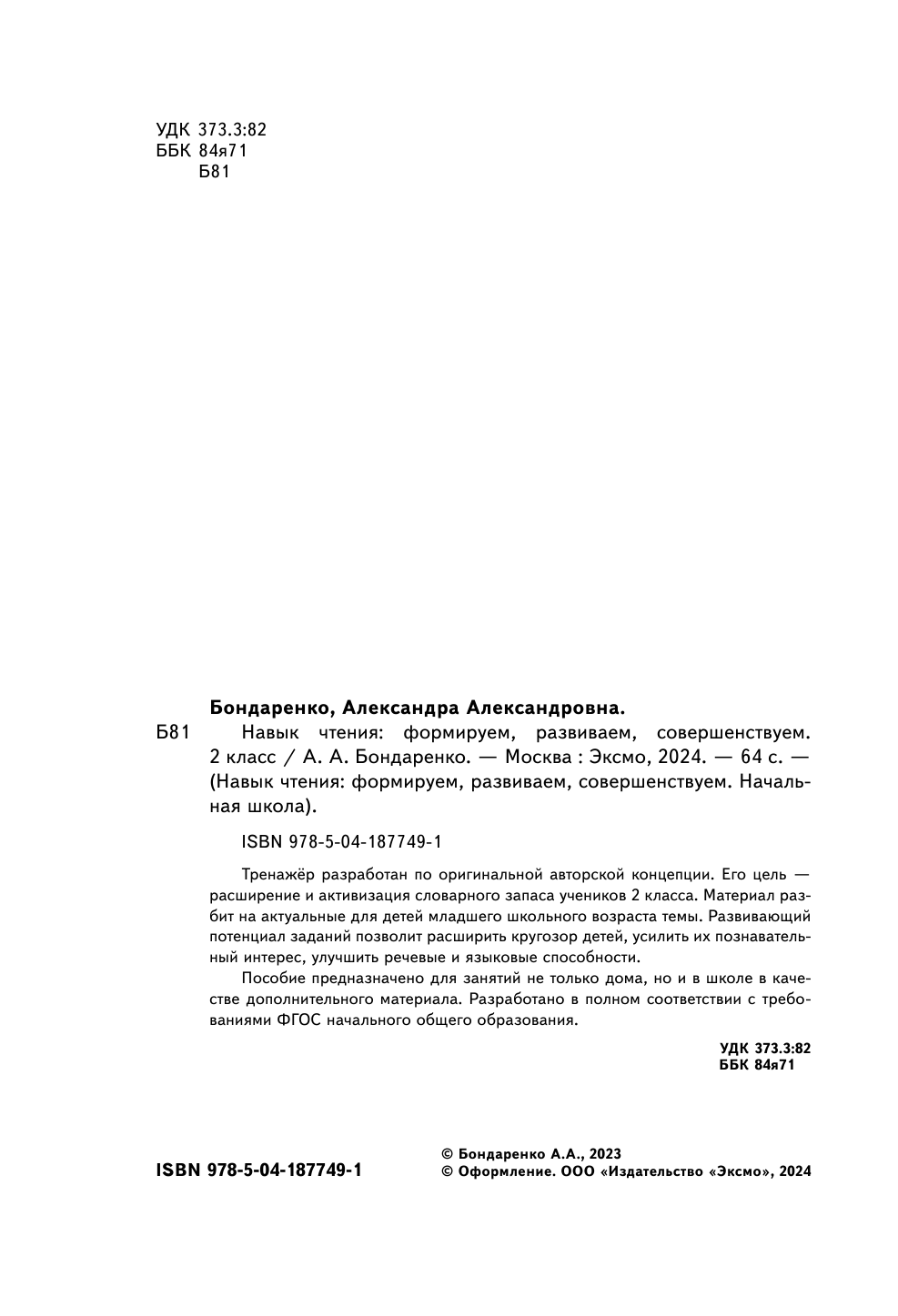 Навык чтения: формируем развиваем совершенствуем. 2 класс (Бондаренко Александра Александровна); ООО "Издательство "Эксмо", 2024