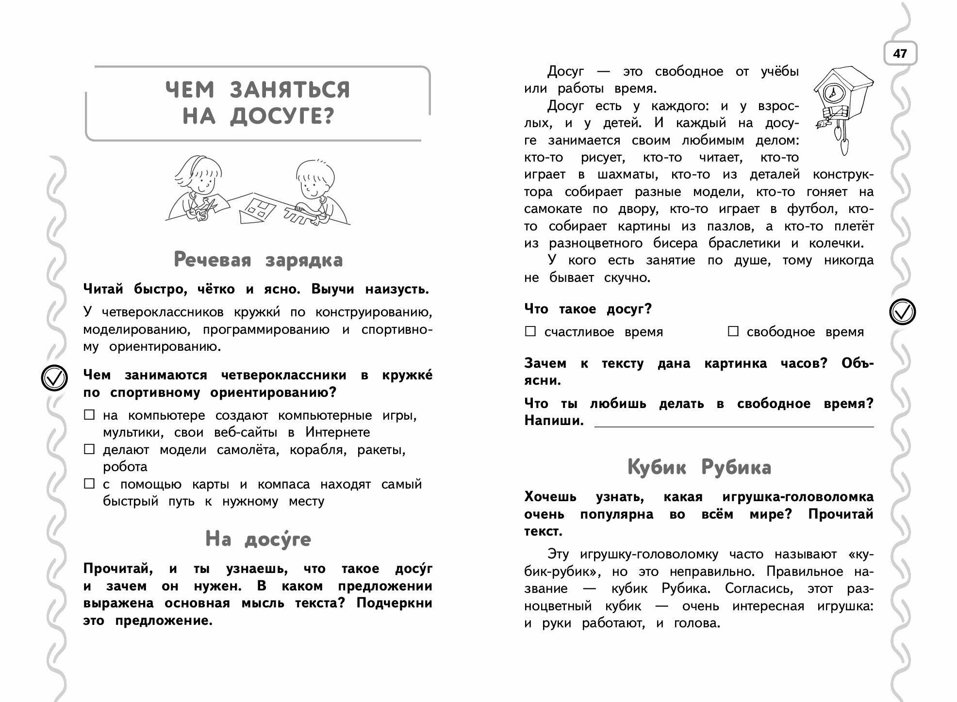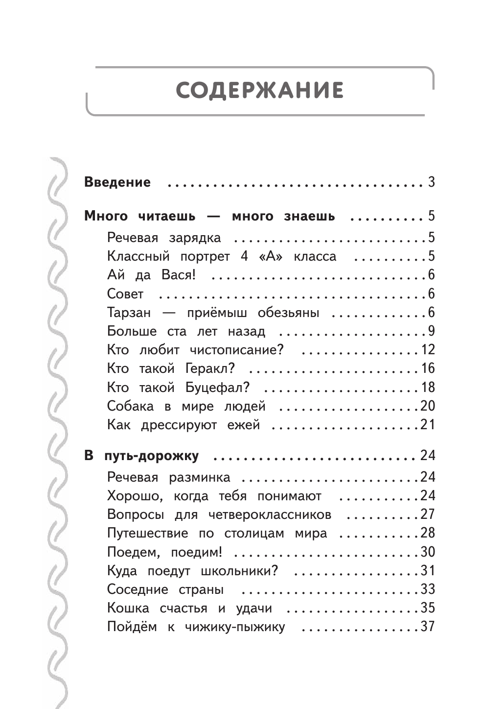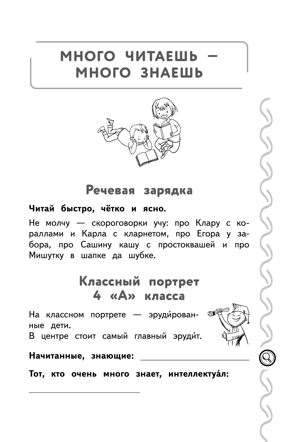 Каждый раздел предлагает разнообразные задания, которые помогут активизировать личный словарный запас ребёнка. Приводятся краткие сведения о происхождении слов, примеры их употребления, стихотворения для заучивания наизусть, а также тексты для расширения кругозора. Благодаря прогрессивной авторской методике четвероклассники не только усовершенствуют навык чтения, но и значительно обогатят свой словарь, улучшат речевые способности и существенно повысят общую эрудицию.