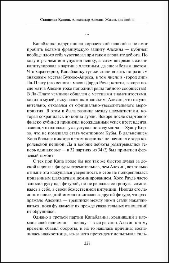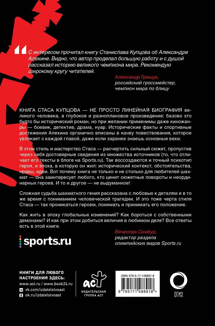 Алехин не просто гений и первый русский чемпион мира по шахматам. Это человек удивительной судьбы. Мировые и гражданская войны, кровавые революции, несостоявшиеся расстрелы, потеря родины, обвинения в коллаборационизме — жизнь Алехина была ужасно непростой, но он удивительным образом приспосабливался. И делал все, чтобы никто не мешал ему заниматься единственным любимым делом, которому он отдавался маниакально, — шахматами. В отличие от большинства других книг об Алехине в этой вы увидите доску с полным набором шахматных фигур: вас ждут подробные истории о великом Ласкере, элегантном Капабланке, члене НСДАП Боголюбове и советском колоссе Ботвиннике, которые были важной частью судьбы нашего героя. Почти вся жизнь Алехина — война. С людьми, с обстоятельствами... Она знала и преодоление, и предательство. И книга автор Станислава Купцова скорее даже не о шахматах, а об утлом суденышке под названием «жизнь». Книга с фотографиями. Под редакцией Арсения Замостьянова.