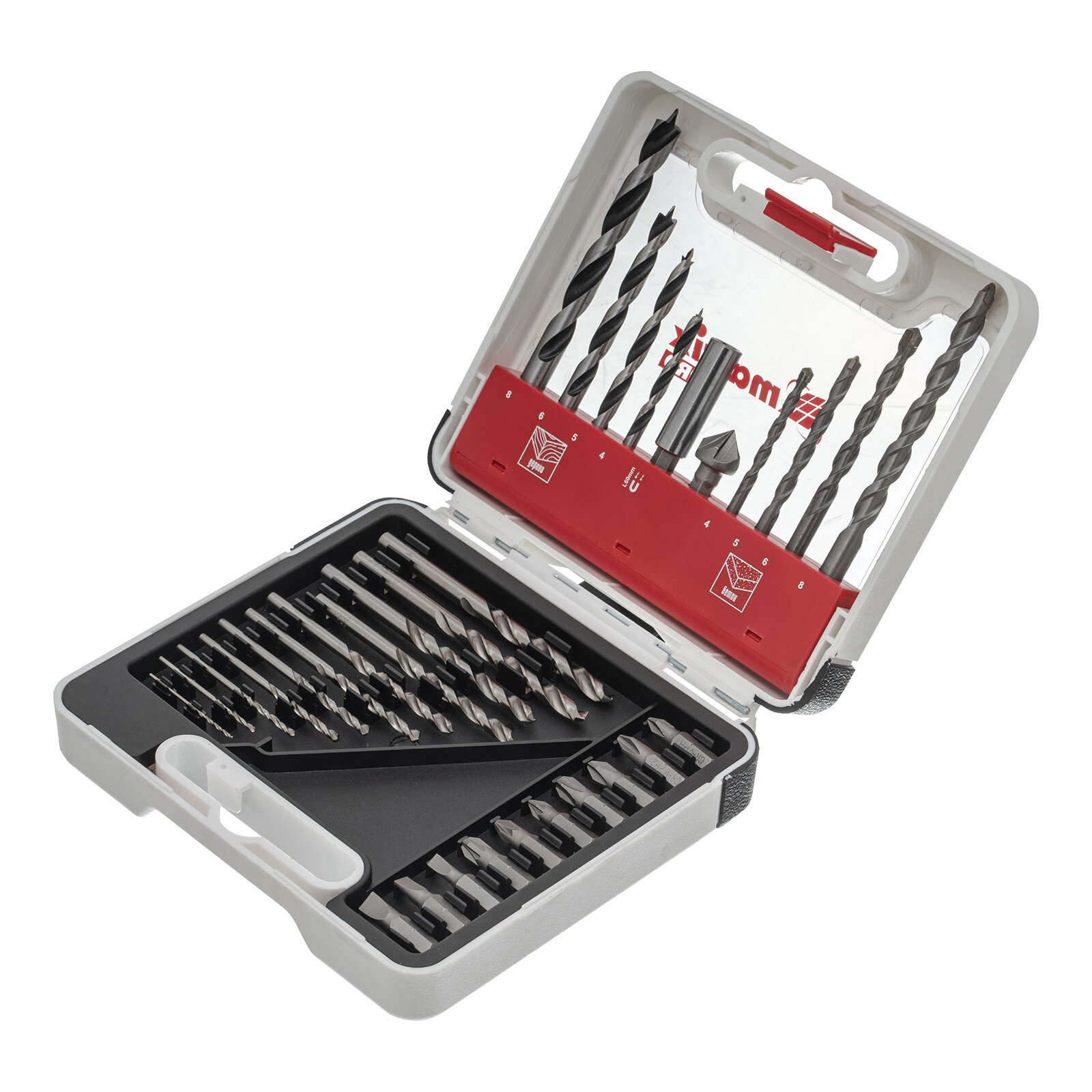 Комбинированный набор Matrix PRO 725631 универсальное решение для мастеров, т. к. он содержит 31 предмет: отверточные биты (9 шт.) и адаптер к ним, зенковку и сверла по дереву 4-8 мм, сверла по бетону 4-8 мм и сверла по металлу 1-6 мм. Оснастка подходит как для бытового использования, так и решения профессиональных задач.