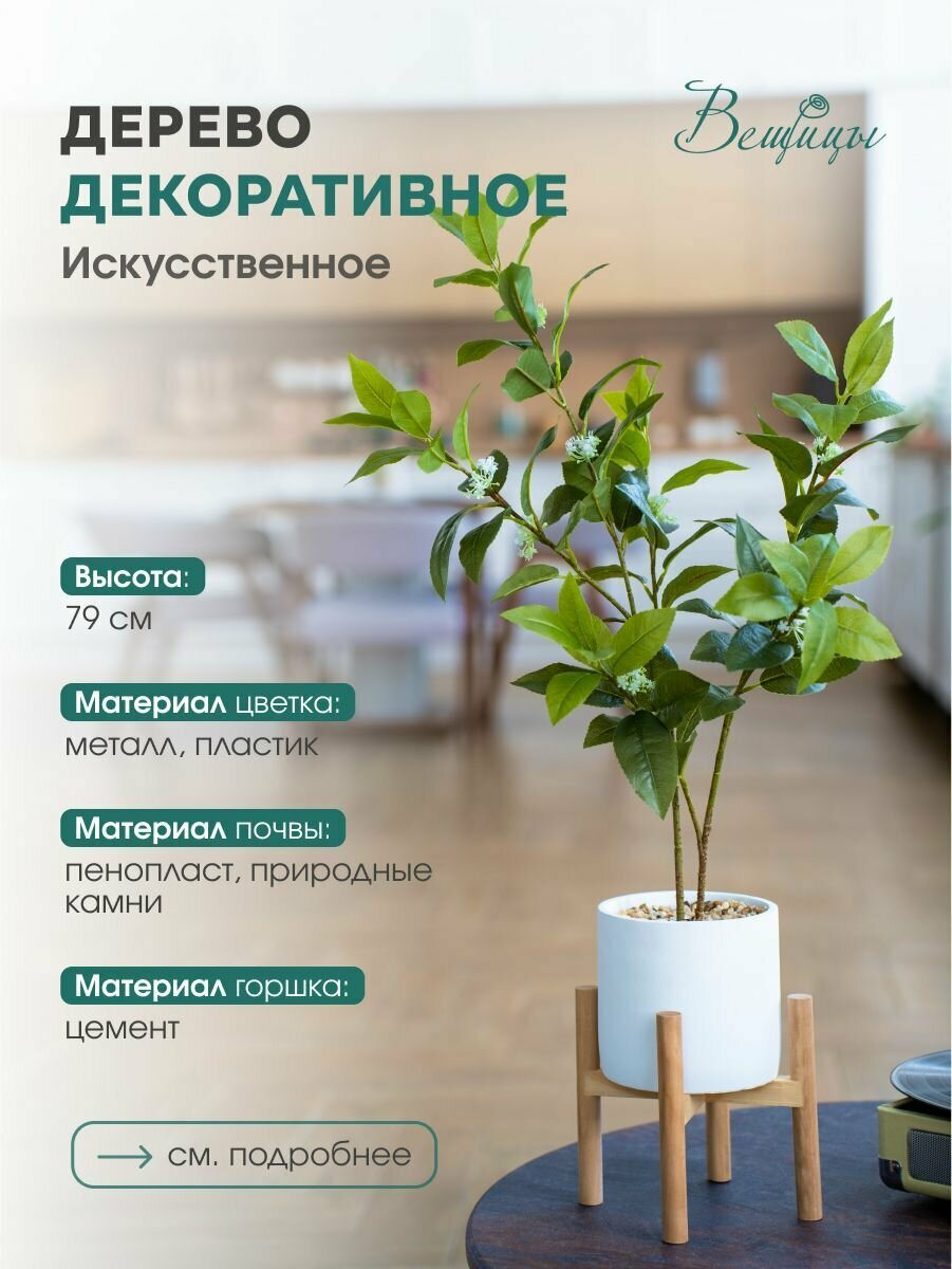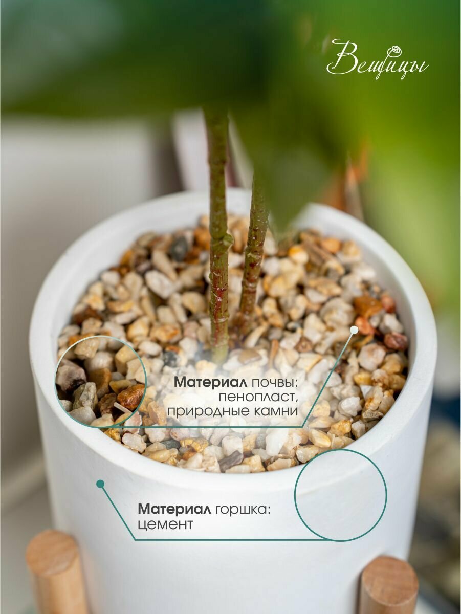 Декоративное дерево в цементном горшке с подставкой. Удобный аксессуар для тумбы, комода или подоконника. Выглядит натурально, так что со стороны не отличается от живого растения. Почва изготовлена из пенопласта, а ствол, ветви и листья - из металла и пластика. На дне горшка расположены протекторы для защиты поверхности от повреждений. Идеальный аксессуар для оживления пространства в домашнем или офисном интерьере: все элементы смотрятся натурально и живо, но не требуют полива или пересадки. Дерево не сыпется, не оставляет пыльцу и не вызывает аллергические реакции. Для ухода достаточно протирать влажной салфеткой.
