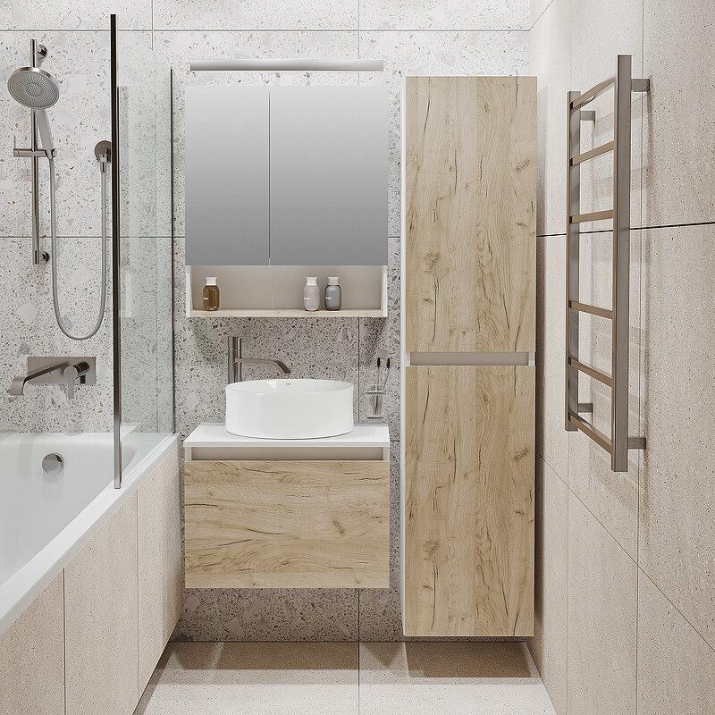 Шкаф-пенал для ванной комнаты RUNO Бари (подвесной) представляет собой идеальное сочетание модных тенденций с классическим дизайном ванной. Он оснащен двумя распашными дверцами, в каждом отделении предусмотрено по одной встроенной полке. Корпус выполнен в классическом белом цвете, в то время как фасад имеет модный оттенок крафтового дуба, что позволяет ему идеально вписаться в любой интерьер ванной комнаты. Каждая дверца комплектуется двумя петлями: верхняя с доводчиком, нижняя без него. Тип: пенал; Тип установки: настенный; Ориентация: универсальная; Дверцы: 2, распашные; Количество секций: 2; Ящики: нет; Полки: 2; Материал фасада: МДФ;