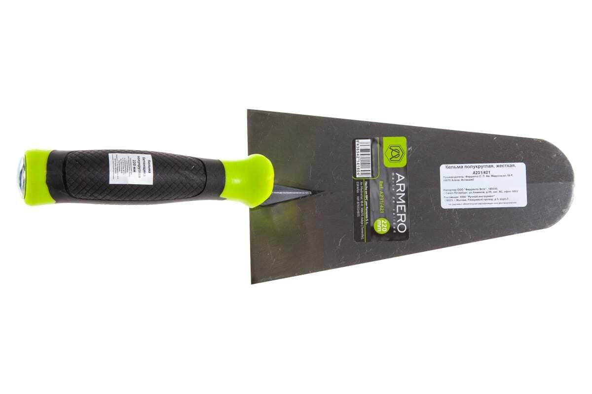Жесткое полукруглое полотно;Полотно выполнено из высокоуглеродистой стали;Двухкомпонентная рукоятка со стальным наконечником;Запатентованная система крепления рукоятки к полотну; Кельма бетонщика ARMERO A231/421 с длиной лезвия 220 мм выполнена в форме закругленного треугольника и применяется для кладки кирпича, перемешивания растворов и нанесения штукатурно-отделочных материалов на обрабатываемую поверхность. Жесткое полотно кельмы выполнено из углеродистой стали толщиной 1.5 мм для увеличения срока службы. Мягкая двухкомпонентная эргономичная рукоятка со стальным наконечником удобно лежит в руке, обеспечивая крепкий захват.