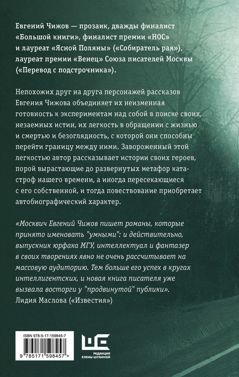 Евгений Чижов — прозаик, дважды финалист «Большой книги», финалист премии «НОС» и лауреат «Ясной Поляны» («Собиратель рая»), лауреат премии «Венец» Союза писателей Москвы («Перевод с подстрочника»). Непохожих друг на друга персонажей рассказов Евгения Чижова объединяет их неизменная готовность к экспериментам над собой в поиске своих, незаемных истин, их легкость в обращении с жизнью и смертью и безоглядность, с которой они способны перейти границу между ними. Завороженный этой легкостью автор рассказывает истории своих героев, порой вырастающие до развернутых метафор катастроф нашего времени, а иногда пересекающиеся с его собственной, и тогда повествование приобретает автобиографический характер. «Москвич Евгений Чижов пишет романы, которые принято именовать "умными": и действительно, выпускник юрфака МГУ, интеллектуал и фантазер в своих творениях явно не очень рассчитывает на массовую аудиторию. Тем больше его успех в кругах интеллигентских, и новая книга писателя уже вызвала восторги у "продвинутой" публики». Лидия Маслова («Известия»)