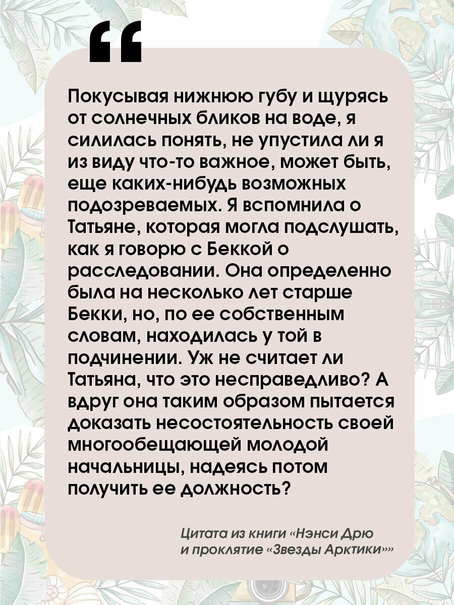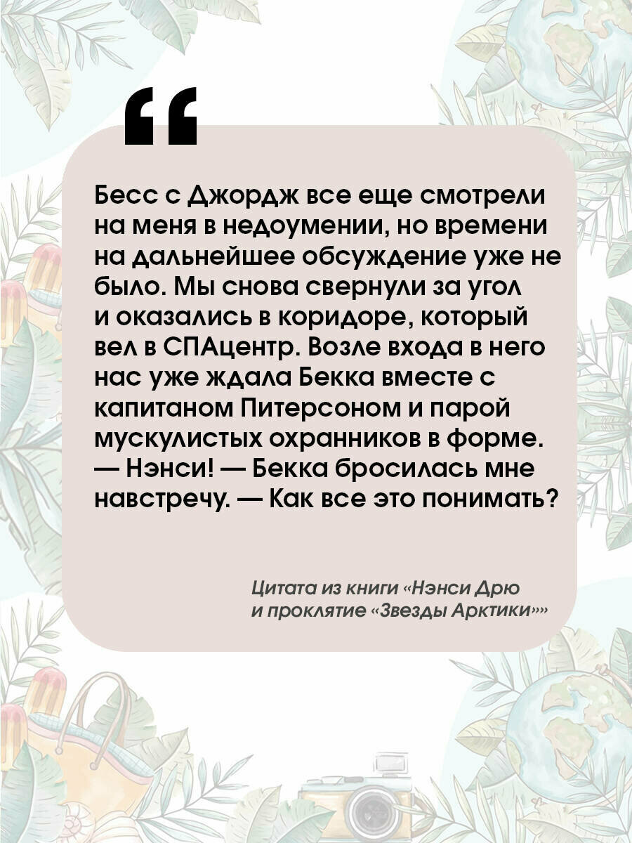 МИРОВОЙ БЕСТСЕЛЛЕР . ПРОДАНО БОЛЕЕ 80 МИЛЛИОНОВ КНИГ . ПЕРЕВЕДЕНА НА 45 ЯЗЫКОВ . БОЛЕЕ 10 ЭКРАНИЗАЦИЙ . БОЛЕЕ 30 КОМПЬЮТЕРНЫХ ИГР На круизном лайнере «Звезда Арктики», который следует вдоль побережья Аляски, происходят странные события, держащие в напряжении персонал и пассажиров корабля. Сыщица Нэнси Дрю и ее близкие друзья оказываются в нужном месте и в нужное время. Они лихорадочно размышляют над тем, кто пытается испортить репутацию нового лайнера, а пока они решают эту сложную задачу, все пассажиры находятся в опасности. Хватит ли у Нэнси сообразительности и хладнокровности, чтобы разоблачить преступника? Детективная история из цикла «Дневники Нэнси Дрю». Для среднего школьного возраста.