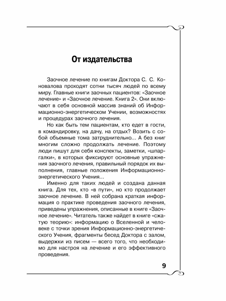 Заочное лечение по книгам Доктора С. С. Коновалова проходят сотни тысяч людей по всему миру. Главные книги для них: "Заочное лечение" и "Заочное лечение. Книга 2". Они включают в себя основной массив знаний об Информационно-энергетическом Учении, возможностях и процедурах заочного лечения. Но как быть тем пациентам, кто едет в гости, в командировку, на дачу, на отдых? Возить с собой объемные тома затруднительно… А без книг многим сложно продолжать лечение. Именно для таких людей и создана данная книга. Для тех, кто "в пути", но кто продолжает заочное лечение.