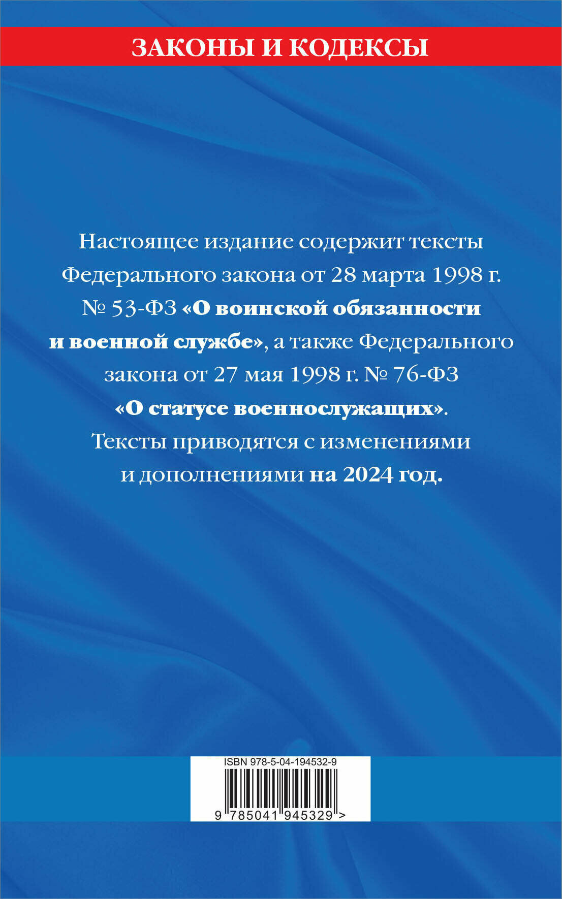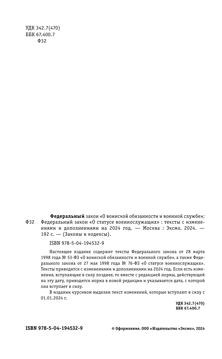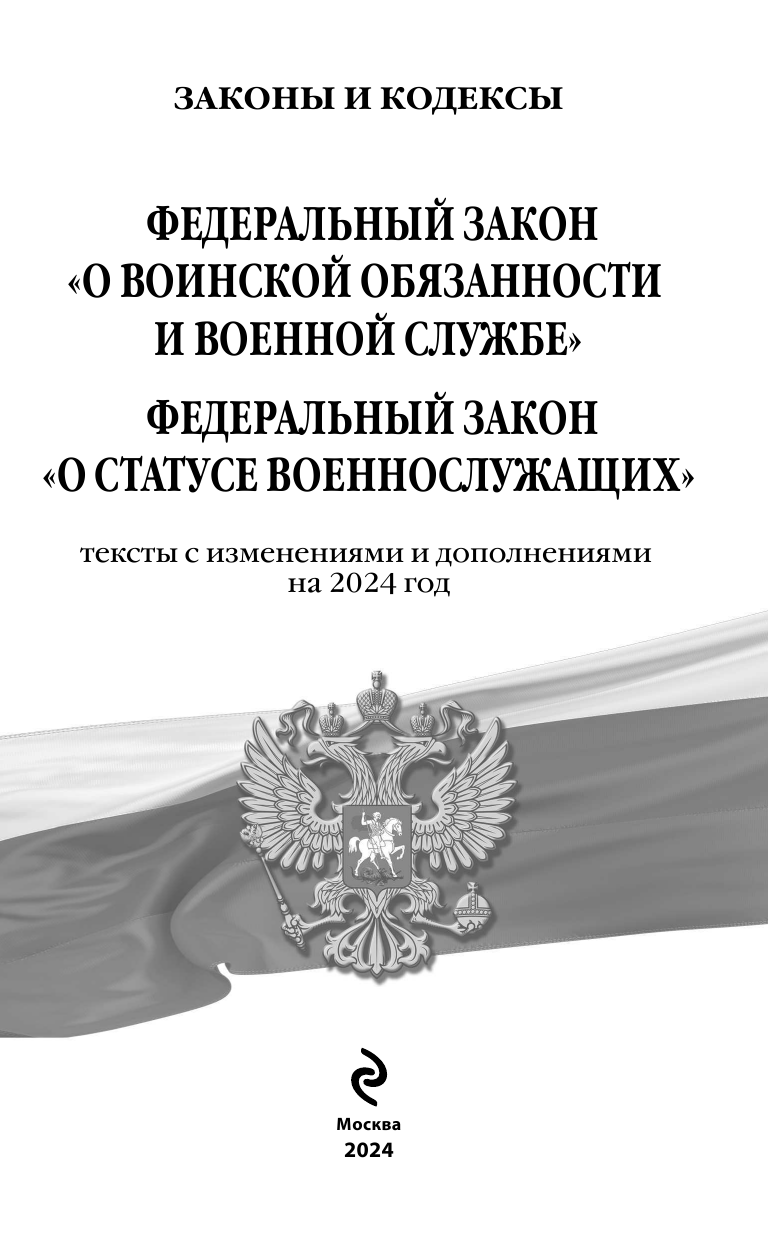 Настоящее издание содержит тексты Федерального закона от 28 марта 1998 года № 53-ФЗ «О воинской обязанности и военной службе», а также Федерального закона от 27 мая 1998 года № 76-ФЗ «О статусе военнослужащих». Тексты приводятся с изменениями и дополнениями на 2024 год. Если есть изменения, вступающие в силу позднее, то вместе с редакцией нормы, действующей на эту дату, приводится норма в новой редакции и указывается дата, с которой она вступает в силу.В издании курсивом выделен текст изменений, которые вступают в силу с 01.01.2024 г.