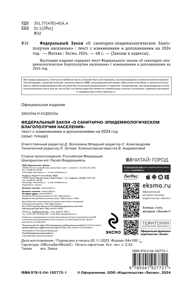Федеральный закон "О санитарно-эпидемиологическом благополучии населения": текст с изменениями на 2024 год (без автора); ООО "Издательство "Эксмо", 2023