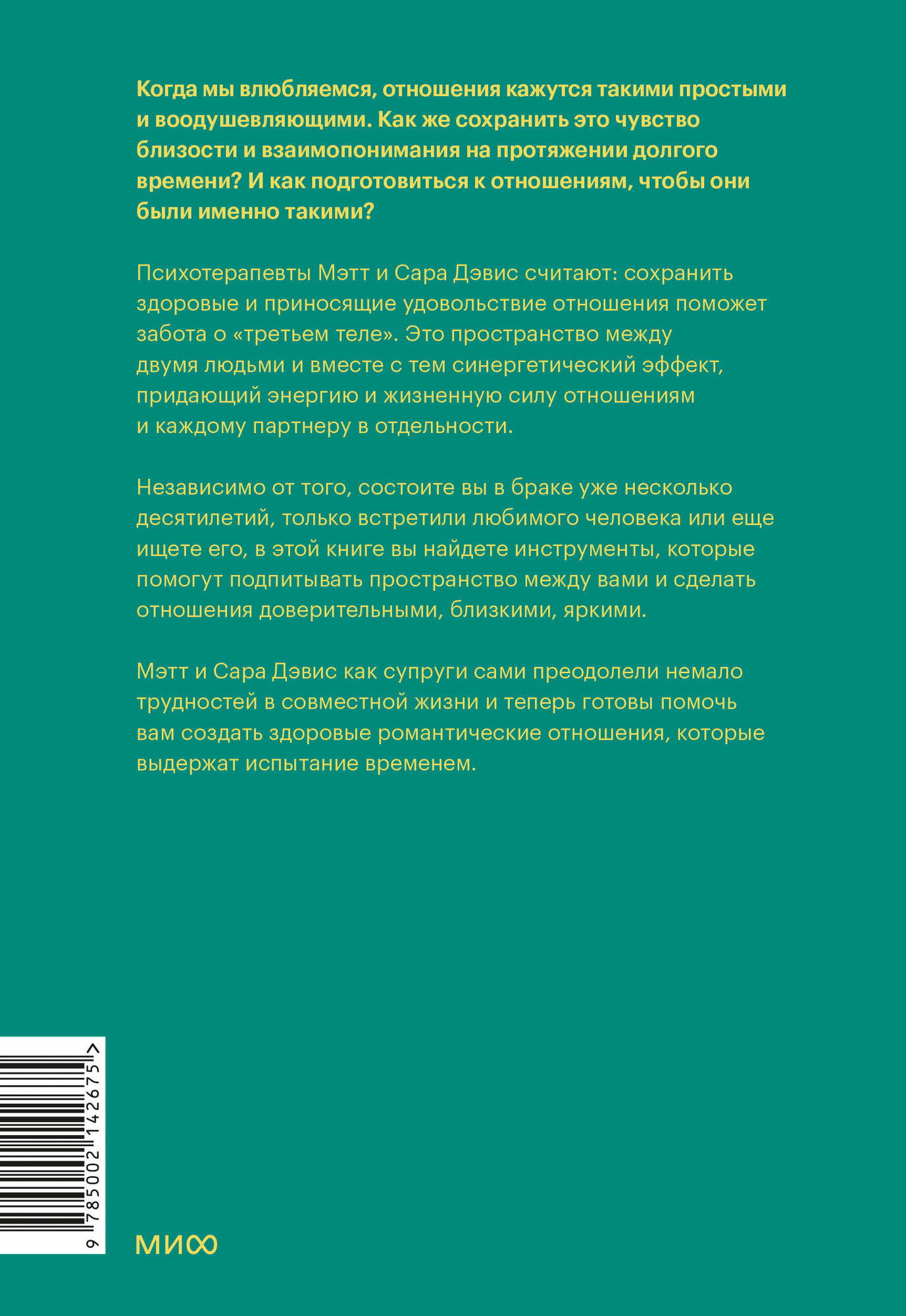 Мэтт и Сара Дэвис, супруги и психотерапевты с 10-летним опытом, предлагают множество вдохновляющих практик для сохранения любви в паре и превращения отношений в источник радости. Когда мы влюбляемся, отношения кажутся такими простыми и воодушевляющими. Как же сохранить это чувство близости и взаимопонимания на протяжении долгого времени? И как подготовиться к отношениям, чтобы они были именно такими? Психотерапевты Мэтт и Сара Дэвис считают: сохранить здоровые и приносящие удовольствие отношения поможет забота о "третьем теле". Это пространство между двумя людьми и вместе с тем синергетический эффект, придающий энергию и жизненную силу отношениям и каждому партнеру в отдельности. Мэтт и Сара Дэвис как супруги сами преодолели немало трудностей в совместной жизни и теперь готовы помочь вам создать здоровые романтические отношения, которые выдержат испытание временем. Авторы делятся своим личным опытом поддержания отношений и методами, основанными на научных исследованиях, которые помогли им спасти свой брак. Независимо от того, состоите вы в браке уже несколько десятилетий, только встретили любимого человека или еще ищете его, в этой книге вы найдете инструменты, которые помогут подпитывать пространство между вами и сделать отношения доверительными, близкими, яркими. Для кого книга Для тех, кто сталкивается с проблемами в отношениях и хочет быть счастливым. Книга подойдет и тем, кто давно в браке, и тем, кто только встретил любимого человека, и тем, кто еще ищет его.
