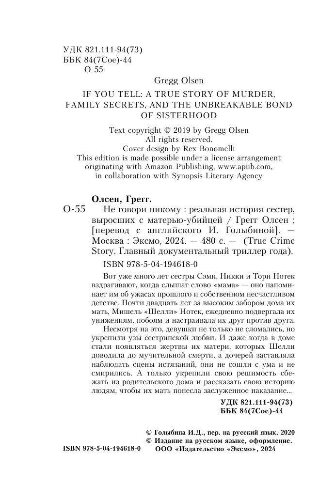 Не говори никому. Реальная история сестер выросших с матерью-убийцей (Грегг Олсен); ООО "Издательство "Эксмо", 2024