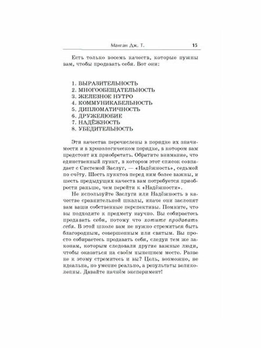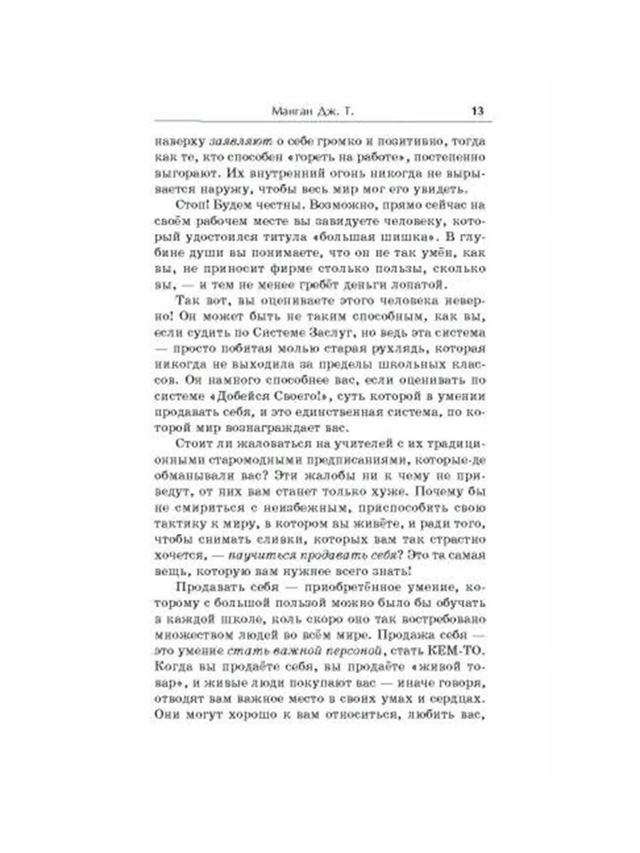 Мир несправедлив. Деньги и славу зачастую получают не те, у кого больше знаний и умений. Увы, мир вознаграждает не самых способных, а тех, кто умеет продвигать себя, или, говоря циничнее, продавать себя. Пока мир таков, надо научиться играть по этим правилам и — выигрывать, а не выживать или погибать. После того, как вы научитесь продвигать себя, большинство других ваших проблем, связанных с материальным успехом, будут решены автоматически.Принципы продвижения себя можно сформулировать точно так же, как правила арифметики или грамматики. Что и делает в своей книге Джеймс Т. Манган. Он излагает эти правила, снабжает вас своего рода учебником практической жизни, в котором есть все трюки, уловки и схемы, которые можно применять в личной практике, и все те ценные качества, которые обеспечат вам достижение самых амбициозных целей.Вы думаете, что слишком застенчивы, робки, боитесь людей или слишком невежественны, чтобы оказаться в центре внимания. Вы будете говорить, что все нужные для этого качества даются человеку от рождения. Но вы ошибаетесь! Умение продвигать себя — это приобретённый навык. Продажа себя — это умение стать важной персоной, стать КЕМ-ТО. Это стоит того, чтобы попытаться — не будьте настолько глупы, чтобы говорить себе, что это невозможно, даже не сделав честной попытки. Сделайте её — и вы увидите, как произойдёт чудо!