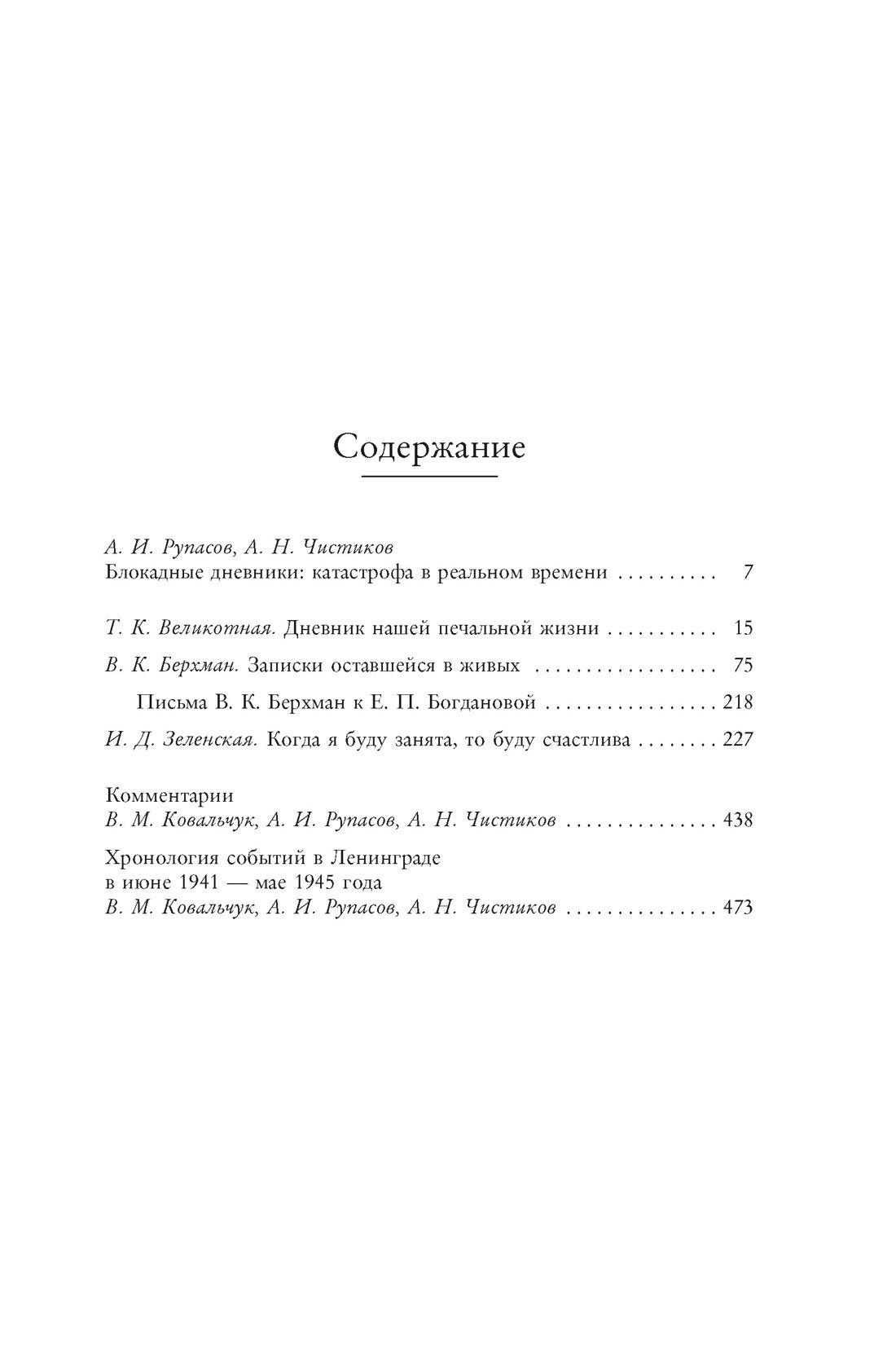 Тем более поразительными и поистине жизнеутверждающими оказываются те дневниковые записи, за которыми, вопреки ужасу блокадной повседневности, отчетливо видна несломленная цельная личность. Таковы публикуемые в этой книге дневники Ирины Дмитриевны Зеленской и сестер Веры Константиновны Берхман и Татьяны Константиновны Великотной. Личные дневники — особый вид литературы: за отдельными исключениями, сторонний читатель оказывается допущен к этим текстам случайно. Но ценность блокадных дневников уникальна и непреходяща: в те страшные дни они служили отдушиной своим авторам, в наши дни — дарят невымышленные примеры жизненной стойкости, утверждая в мысли, что даже в нечеловеческих условиях возможно оставаться человеком.