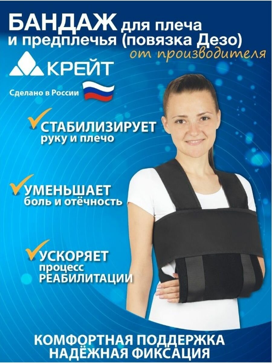 Бандаж для плеча и предплечья - "Крейт". Повязка Дезо на плечевой сустав взрослая.В разм. таблице - обхват над грудью.№1, (84-115 см)№2, (108-125 см)Как правильно сделать замер: обхват над грудью – измеряется от горизонтально вокруг туловища, спереди сантиметровая лента проходит над основанием грудных желез. Более детально в схеме на фото.Бандаж на руку при переломе, повязка Дезо, для фиксации и разгрузки плечевого и локтевого суставов. Оказывает поддержку руки с фиксацией к туловищу. Комфортно поддерживает и надёжно фиксирует плечо и предплечье после травм и операций. Формирует правильное положение руки и обеспечивает профилактику повторного травматизма. Уменьшает боль и отёчность. Бандаж на плечо изготовлен из дышащего хлопчатобумажного материала. Съемный пояс прижимает руку к туловищу. Фиксация на застежку - липучку. Муфта для поддержки верхней конечности в правильном положении регулируется по высоте и объему. Бандаж Дезо подходит и мужчинам, и женщинам на рост 165-180 см. Конструкция универсальна для правой и левой руки.