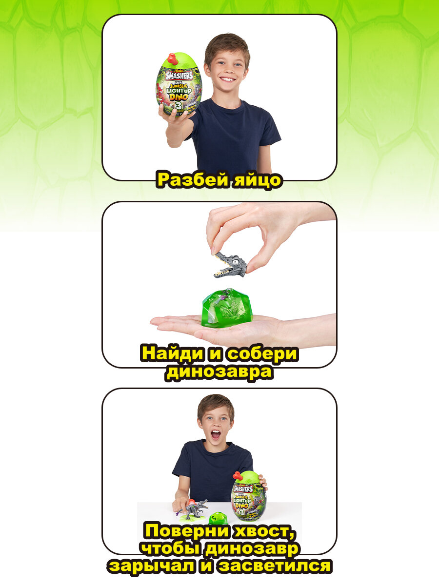 Перенеситесь в эпоху юрского периода! Вас ждёт более 10 ревущих сюрпризов Smashers. Разбейте светящееся яйцо и исследуйте находки: копайтесь в песке и слизи, чтобы отыскать все части Дино. Соберите своего SMASH-O-SAUR. Дёргайте рептилию за хвост, чтобы увидеть, как она загорается и ревёт. В коллекции 3 динозавра: Ти-Рекс, Стегозавр и Спинозавр. Соберите всех и устройте грозную битву! Кто победит?Особенности:Коллекция состоит из 3 динозавров.Дети смогут почувствовать себя археологами, раскапывающими древних рептилий.Собранный собственными руками динозавр станет любимой игрушкой ребёнка.Игрушки изготовлены из экологически чистых материалов, безопасных для здоровья детей, в красках не содержится вредных примесей.В комплекте:1 мини-яйцо Дино1 пакет метеоритной пыли1 слайм Дино1 SMASH-O-SAUR1 слайм из лавы1 руководство коллекционераХарактеристики:Для детей от 3 лет.Опасность удушья.