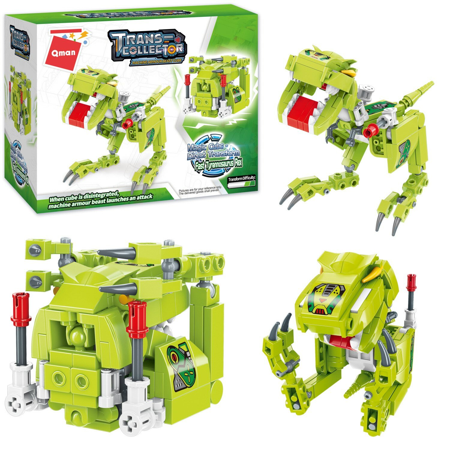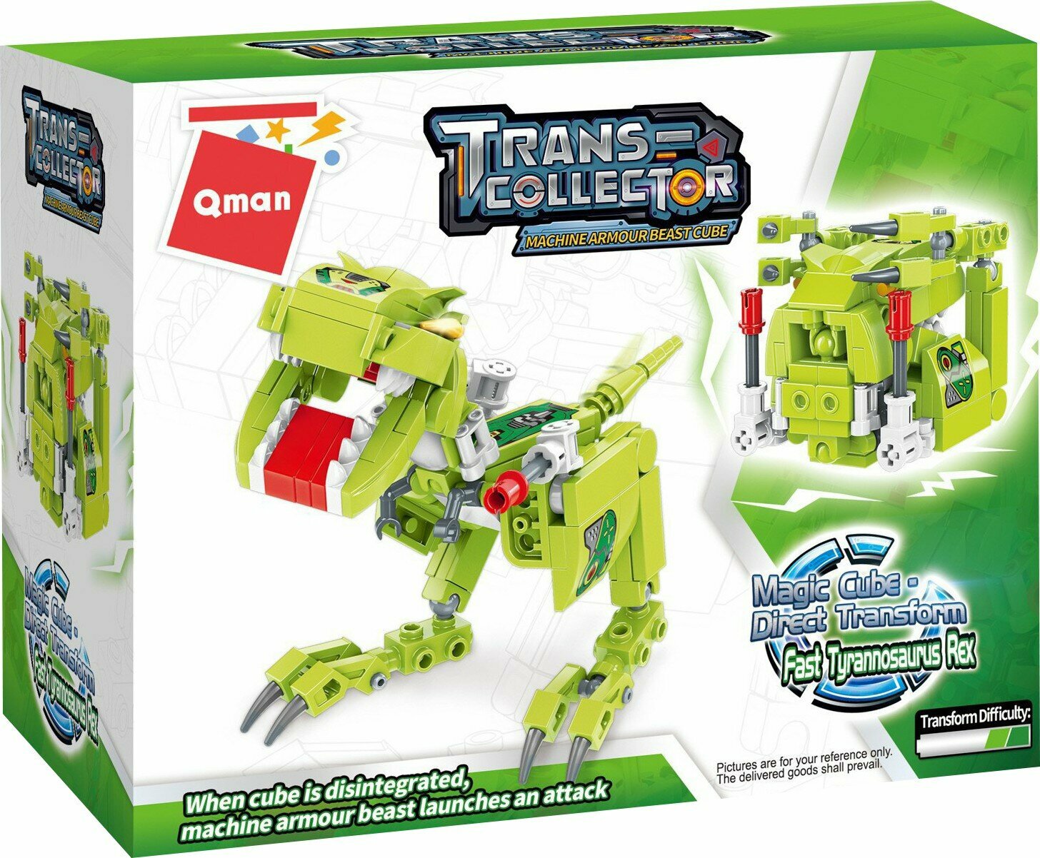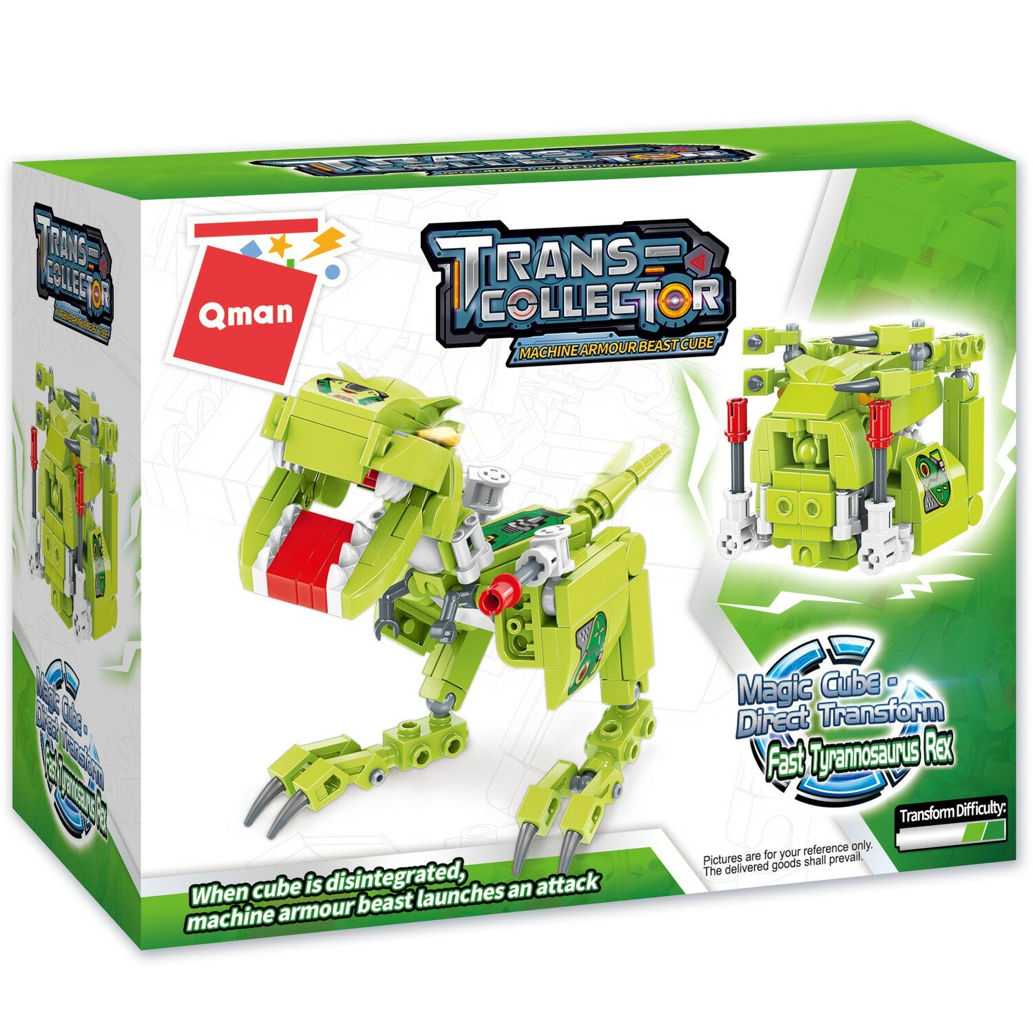 Из конструктора от бренда QMAN из серии «Trans-collector» ребенок может собрать собственными руками фигурку Тираннозавра Рекса с пусковой установкой на лапке, который в несколько движений может быть трансформирован в куб. Простое и надежное соединение деталей разных размеров и форм между собой обеспечат специальные крепления. Во время игры ребенок сможет задействовать свою фантазию и придумать интересные сценарии. В процессе сборки и игры с готовой моделью юный конструктор будет развивать мелкую моторику рук, пространственное мышление, внимательность и усидчивость.