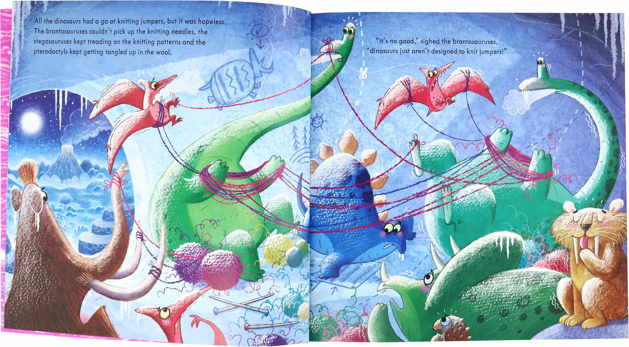 Brrr! The Ice Age is coming, the temperatures are dropping and the dinosaurs are frrreezing. Only one thing will keep them warm - woolly jumpers! But dinosaurs can't knit, can they?