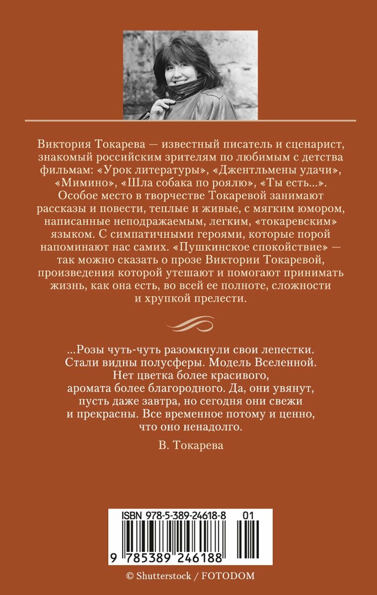 Виктория Токарева — известный писатель и сценарист, знакомый российским зрителям по любимым с детства фильмам: «Урок литературы», «Джентльмены удачи», «Мимино», «Шла собака по роялю», «Ты есть...». Особое место в творчестве Токаревой занимают рассказы и повести, теплые и живые, с мягким юмором, написанные неподражаемым, легким, «токаревским» языком. С симпатичными героями, которые порой напоминают нас самих. «Пушкинское спокойствие» — так можно сказать о прозе Виктории Токаревой, произведения которой утешают и помогают принимать жизнь, как она есть, во всей ее полноте, сложности и хрупкой прелести. В издание вошли прозаические произведения Виктории Токаревой, включая повести «Тихая музыка за стеной», «Ангел-хранитель», рассказы «Ни с тобой, ни без тебя», «Хрустальный башмачок», «Брат и сестра», «Короткие гудки» и др.