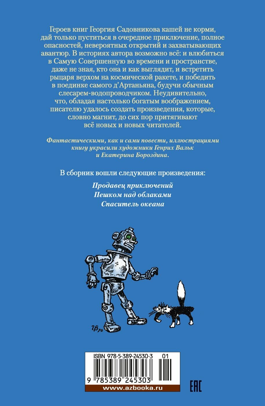 Некогда Аскольд Витальевич был великим астронавтом, облетевшим космос вдоль и поперёк. Однако даже великим людям рано или поздно приходится выйти на пенсию. Вот только как усидеть на месте, если душа требует захватывающих приключений? И одно такое, как наудачу, подвернулось. А началось всё с того, что племянник астронавта Петенька влюбился. И не в кого-то там, а в Самую Совершенную во времени и пространстве! Правда, молодой человек не знал ни её имени, ни как она выглядит, ни где живёт… Но так ещё интереснее! В компании племянника, парочки друзей, кота Мяуки и старого робота Кузьмы Аскольд Витальевич отправляется на поиски таинственной незнакомки. И не важно, сколько опасностей встретится им на пути, ведь, как известно, когда дело касается любви, отважным путешественникам нипочём ни скользкий космический лёд, ни горячие звёзды! Не меньше увлекательных приключений произошло и с героями двух других повестей — «Пешком над облаками» и «Спаситель океана», также вошедших в этот сборник. А фантастическими, как и сами истории, иллюстрациями книгу украсили художники Генрих Вальк и Екатерина Бороздина.