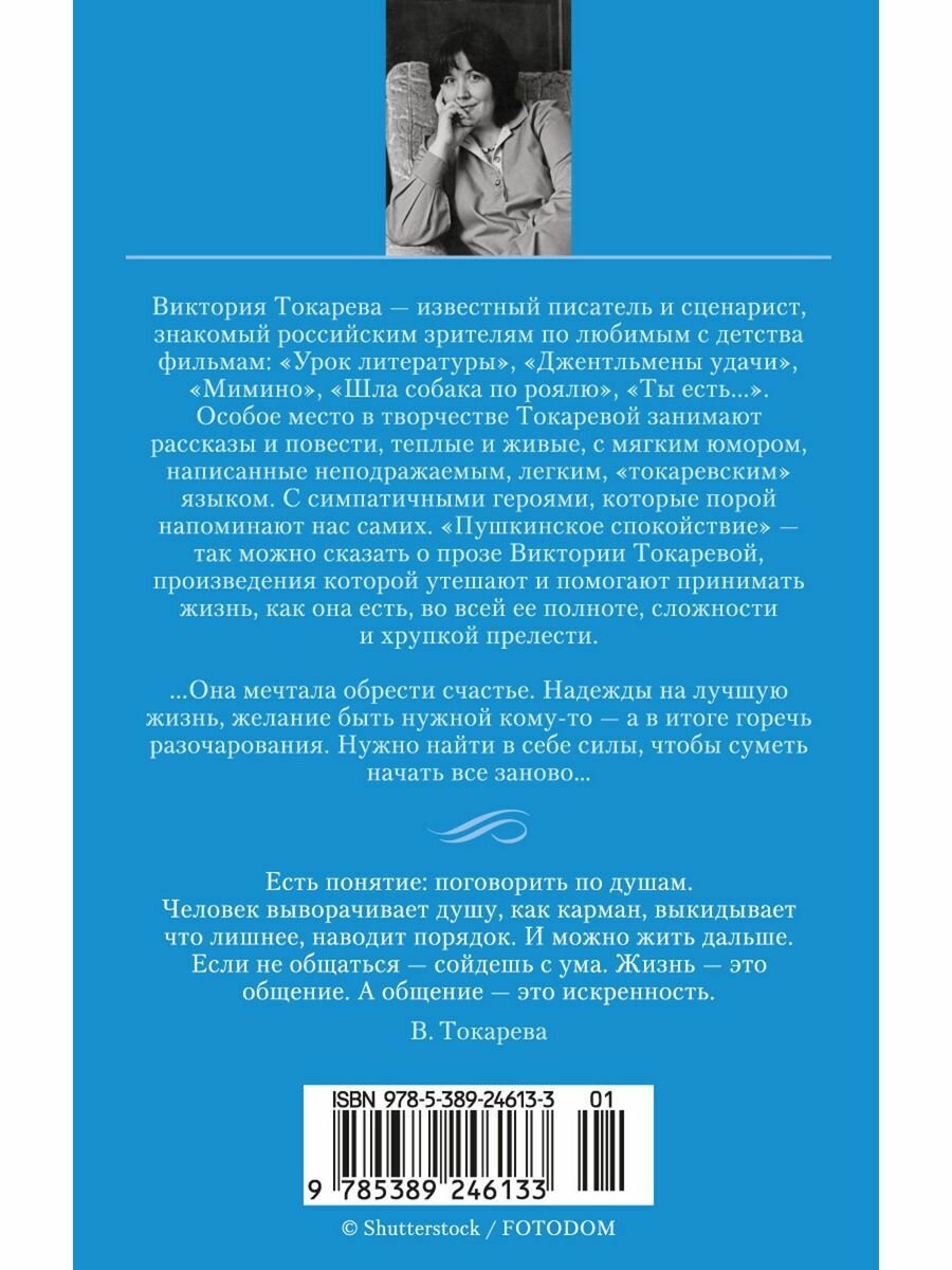 Виктория Токарева — известный писатель и сценарист, знакомый российским зрителям по любимым с детства фильмам: «Урок литературы», «Джентльмены удачи», «Мимино», «Шла собака по роялю», «Ты есть...». Особое место в творчестве Токаревой занимают рассказы и повести, теплые и живые, с мягким юмором, написанные неподражаемым, легким, «токаревским» языком. С симпатичными героями, которые порой напоминают нас самих. «Пушкинское спокойствие» — так можно сказать о прозе Виктории Токаревой, произведения которой утешают и помогают принимать жизнь, как она есть, во всей ее полноте, сложности и хрупкой прелести. ...Она мечтала обрести счастье. Надежды на лучшую жизнь, желание быть нужной кому-то — а в итоге горечь разочарования. Нужно найти в себе силы, чтобы суметь начать все заново... В настоящее издание вошли рассказы и повести 1970–1990-х годов.