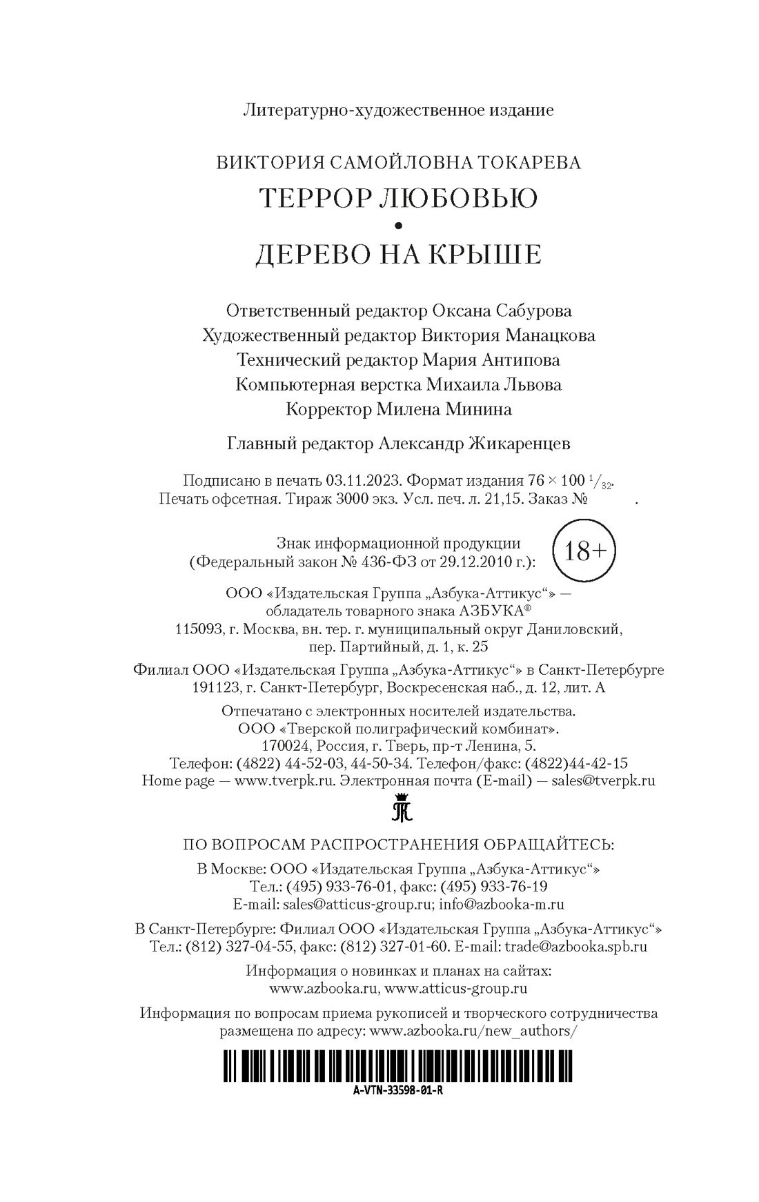 Террор любовью. Дерево на крыше (Токарева Виктория Самойловна); Азбука Издательство, 2023