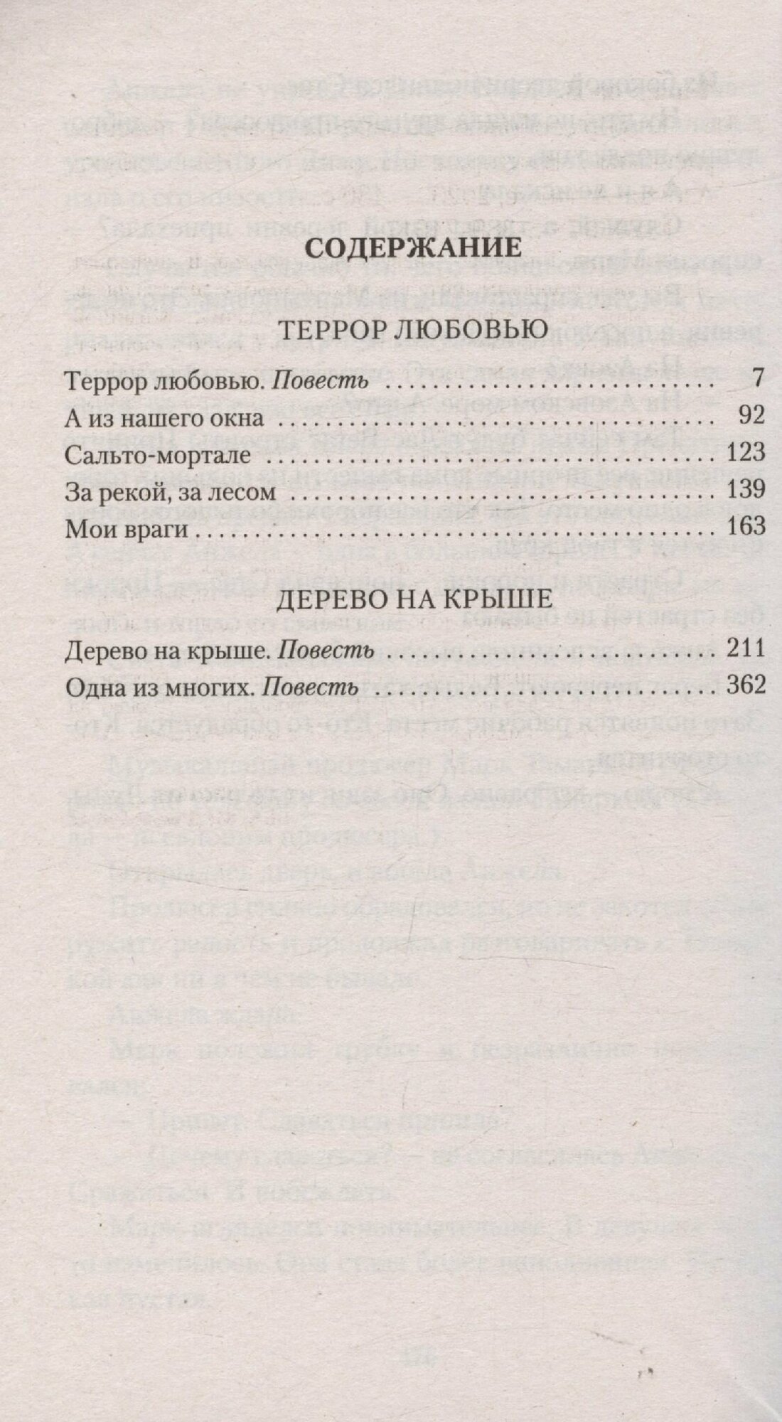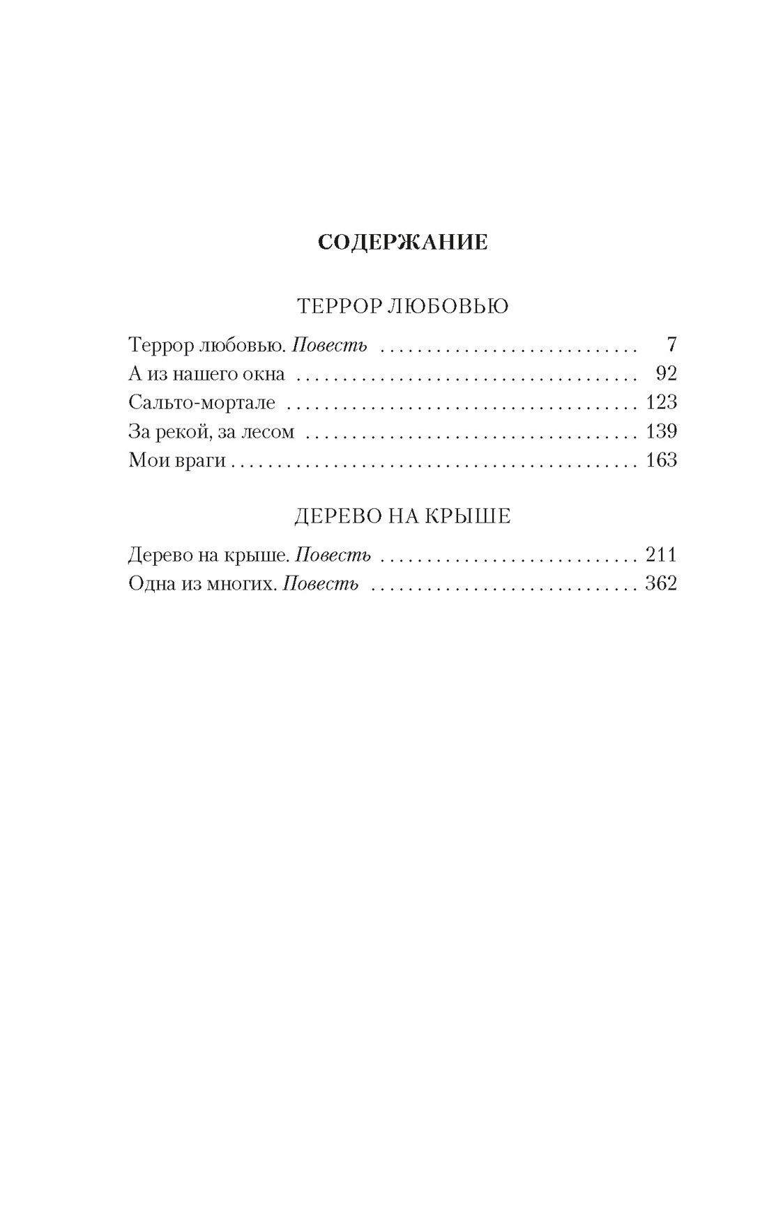 Виктория Токарева — известный писатель и сценарист, знакомый российским зрителям по любимым с детства фильмам: «Урок литературы», «Джентльмены удачи», «Мимино», «Шла собака по роялю», «Ты есть...». Особое место в творчестве Токаревой занимают повести и рассказы, с мягким и добрым юмором, написанные неподражаемым, легким, «токаревским» языком, которые всегда трогают за живое. Что такое счастье и свобода и где та граница, которая отделяет нас от близких людей? Есть ли у любви возраст и чем она отличается от привычки или от жалости? Яростный, бескомпромиссный шантаж и деспотичное обожание – это тоже лики любви?.. Чтобы найти ответ и принять простые истины, которые дает жизнь, героям Токаревой, как и нам, порой приходится пройти длинной дорогой ошибок, страданий и заблуждений. В издание вошли прозаические произведения Виктории Токаревой, включая повести «Террор любовью», «Дерево на крыше», «Одна из многих», рассказы «Сальто-мортале», «Мои враги» и др.