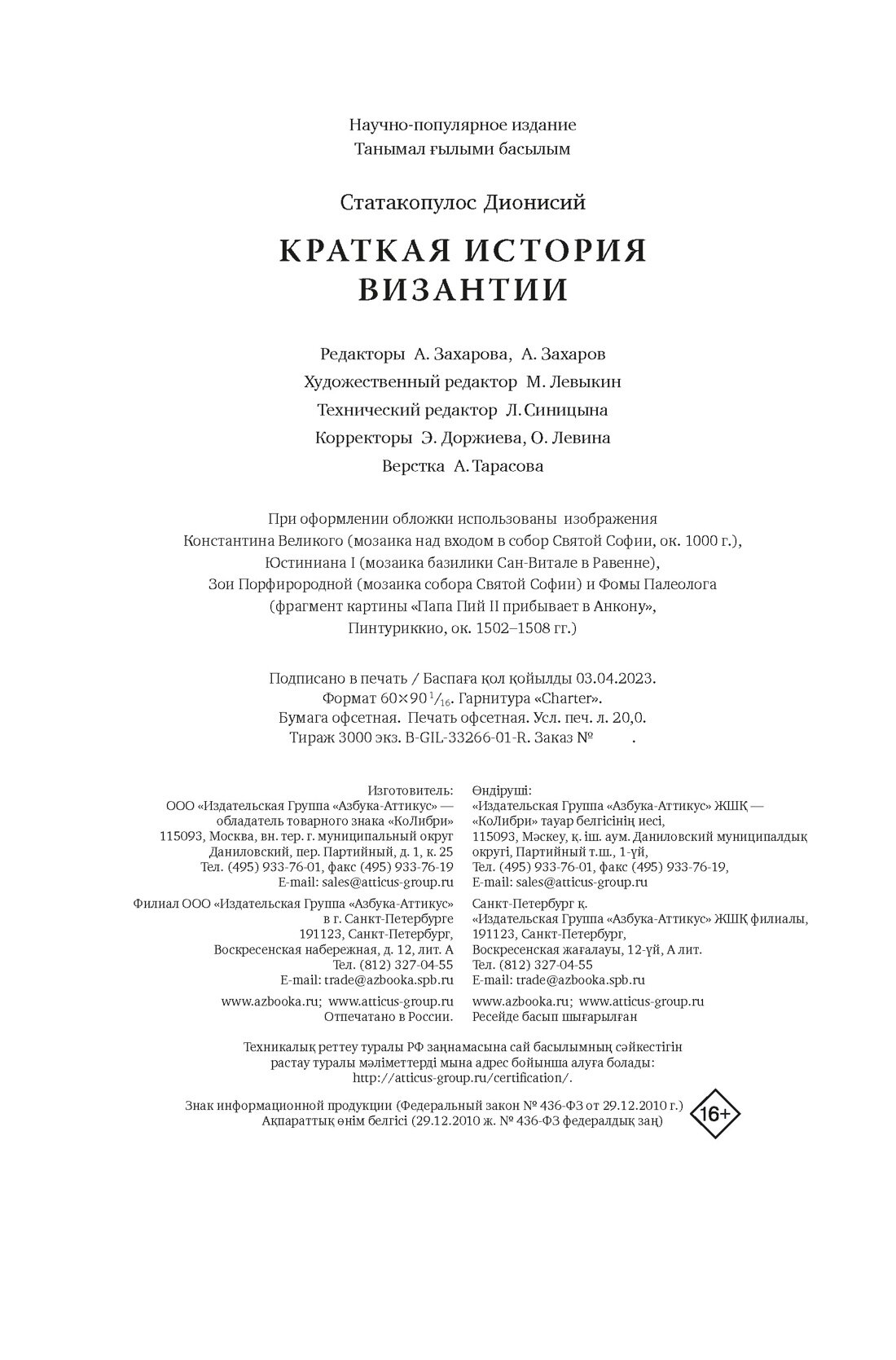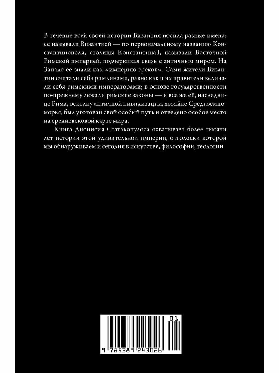 История Византии берет начало в IV веке. Возникнув в результате глубокого кризиса Римской империи, она превратилась в одно из самых могущественных государств Средневековья и более тысячи лет занимала особое положение между восточным и западным миром. Известный исследователь-византинист, автор книг Дионисий Статакопулос показывает развитие Византии с момента раздела Римской империи до самого падения Константинополя в 1453 году, выделяя основные этапы в ее поразительной и неоднозначной истории. Особое внимание уделяется историческому фону, на котором Византия достигла своего расцвета, и наследию, оставленному долгой историей этого государства. Статакопулос глубоко анализирует политические события, экономику, социальную систему, культуру Византийской империи и причины, по которым она стала центром искусств, теологии, образования на многие века вперед. Издание содержит карты, черно-белые иллюстрации, а также подробное приложение со сведениями о народах, соседствующих с Византией, и ее хронологии. Ранее книга издавалась в серии «Исторический интерес: краткая история» под заголовком «Краткая история: Византийская империя».