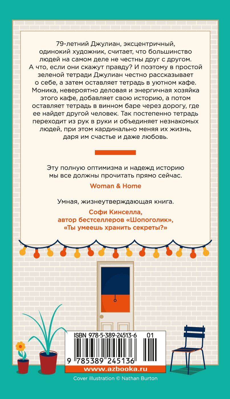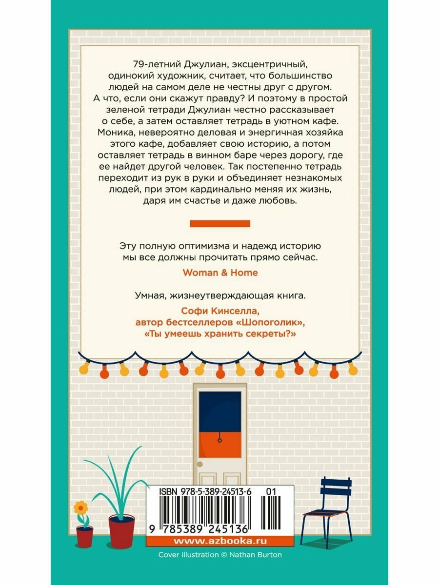 79-летний Джулиан, эксцентричный, одинокий художник, считает, что большинство людей на самом деле не честны друг с другом. А что, если они скажут правду? И поэтому в простой зеленой тетради Джулиан честно рассказывает о себе, а затем оставляет тетрадь в уютном кафе. Моника, невероятно деловая и энергичная хозяйка этого кафе, добавляет свою историю, а потом оставляет тетрадь в винном баре через дорогу, где ее найдет другой человек. Так постепенно тетрадь переходит из рук в руки и объединяет незнакомых людей, при этом кардинально меняя их жизнь, даря им счастье и даже любовь...