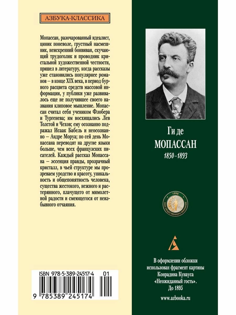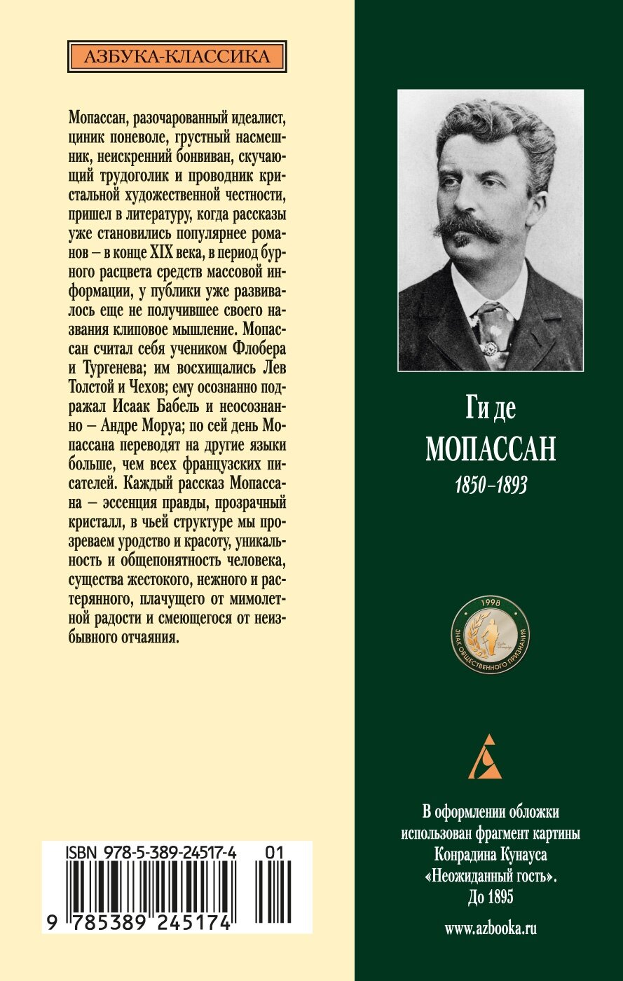 Мопассан, разочарованный идеалист, циник поневоле, грустный насмешник, неискренний бонвиван, скучающий трудоголик и проводник кристальной художественной честности, пришел в литературу, когда рассказы уже становились популярнее романов — в конце XIX века, в период бурного расцвета средств массовой информации, у публики уже развивалось еще не получившее своего названия клиповое мышление. Мопассан считал себя учеником Флобера и Тургенева; им восхищались Лев Толстой и Чехов; ему осознанно подражал Исаак Бабель и неосознанно — Андре Моруа; по сей день Мопассана переводят на другие языки больше, чем всех французских писателей. Каждый рассказ Мопассана — эссенция правды, прозрачный кристалл, в чьей структуре мы прозреваем уродство и красоту, уникальность и общепонятность человека, существа жестокого, нежного и растерянного, плачущего от мимолетной радости и смеющегося от неизбывного отчаяния.