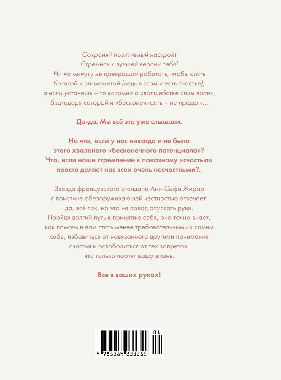 «Позитивный настрой — вот ключ ко всему!» — уверяют нас бесконечные ряды книг по саморазвитию. «Раскрой свой потенциал, чтобы стать богатой и знаменитой (ведь в этом и есть счастье)!» — призывают гуру успешного успеха в интернете. «Наверное, я просто недостаточно стараюсь, раз до сих пор не живу жизнью своей мечты», — с грустью думаете вы, натыкаясь на фото неизменно счастливых и успешных знакомых в соцсетях. Но что, если у нас никогда и не было этого хваленого «бесконечного потенциала»? Что, если наше стремление к показному «счастью» просто делает нас всех очень несчастными?.. «Не огорчайтесь!» — отвечает автор этой книги Анн-Софи Жирар. Даже если это правда — это не повод опускать руки. Пройдя долгий путь к принятию себя, она точно знает, как помочь и вам стать менее требовательными к самим себе, избавиться от навязанного другими понимания счастья и освободиться от тех запретов, что только портят вашу жизнь. Дерзайте!