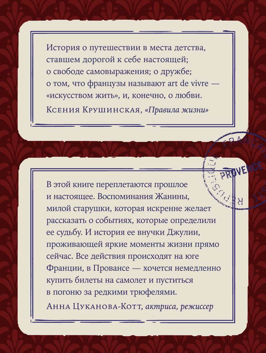 Молодая писательница Джулия приезжает в Прованс к своей бабушке Жанине, с которойслучилась беда. Она находит адресованный ей дневник - Жанина начала вести его, понимая,что теряет память. Душевное, теплое и полное искренности повествование переносит насв солнечный Прованс, наполненный тонкими ароматами лаванды и черных трюфелей, музыкой любви и атмосферой полузабытых тайн. Одна за другой, страницы дневника открыва-ют Джулии историю ее семьи, полную драм и надежд, любви и коварства. Погружение впрошлое самым неожиданным образом отражается на жизни самой Джулии и всех, кто ееокружает, в корне меняя ее, и даря надежду, вдохновение и прощение.