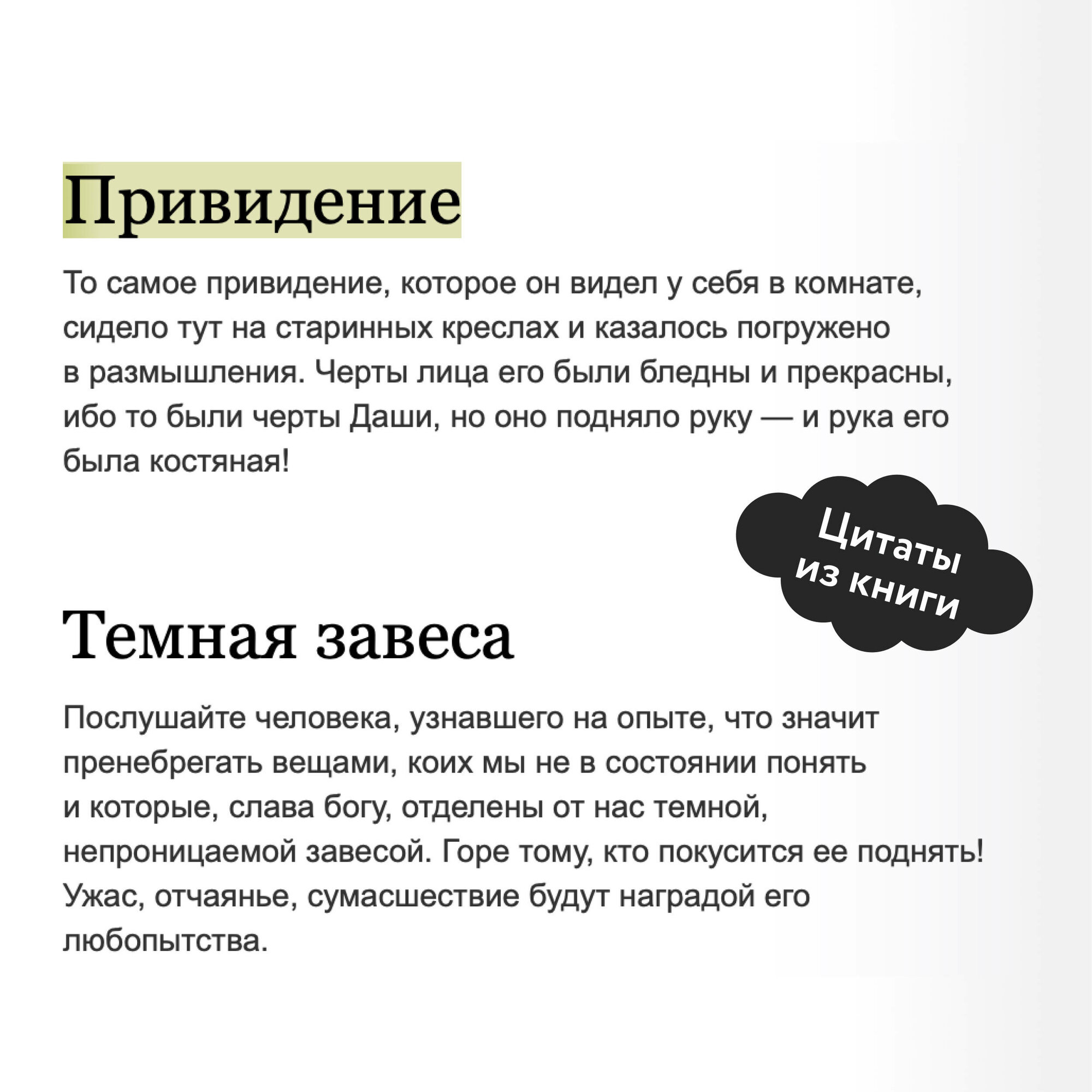 То самое привидение, которое он видел у себя в комнате, сидело тут на старинных креслах и казалось погружено в размышления. Черты лица его были бледны и прекрасны, ибо то были черты Даши, но оно подняло руку — и рука его была костяная!