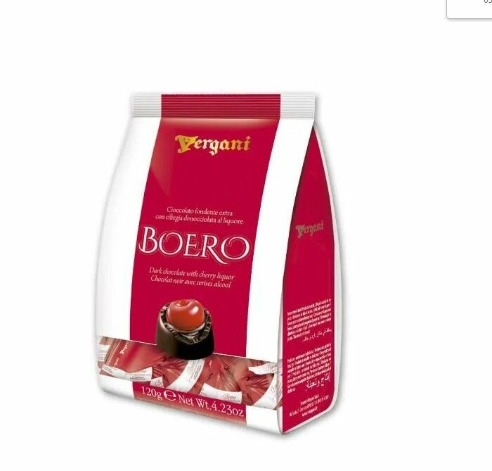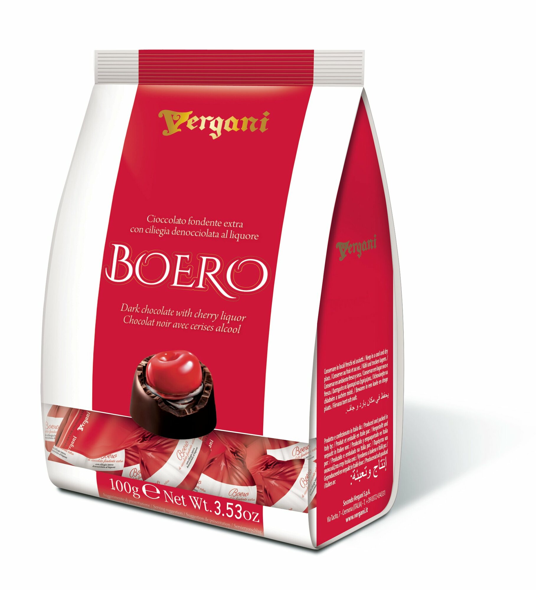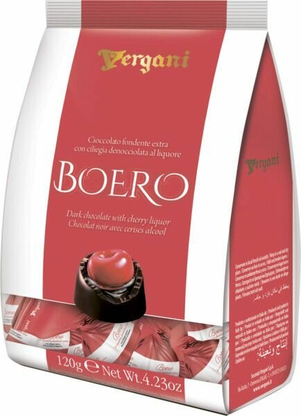 Secondo Vergani — итальянская компания, которая была названа в честь основателя, Секондо Вергани, который до 1881 года работал бакалейщиком, а потом купил небольшой магазинчик и занялся производством нуги. В 1920 году компания расширила свой ассортимент, а с 1930 года магазинчик трансформировался в производственное предприятие и начал поставлять сладости за рубеж.Сегодня штаб-квартира Secondo Vergani находится в регионе Ломбардия. Компании принадлежат несколько предприятий, а ассортимент включает пралине, нугу, шоколадные конфеты с кремовыми, алкогольными и фруктовыми начинками.Vergani, "Boero" — изысканные конфеты с алкогольно-фруктовой начинкой. Это лакомство представляет собой заспиртованную вишню, покрытую шоколадом фондю. Набор обязательно понравится взрослым. Конфеты производятся по лучшим рецептам итальянских шоколатье из качественных ингредиентов — какао-пасты, вишни, алкоголя и пр. Содержание в них какао не менее 52%.