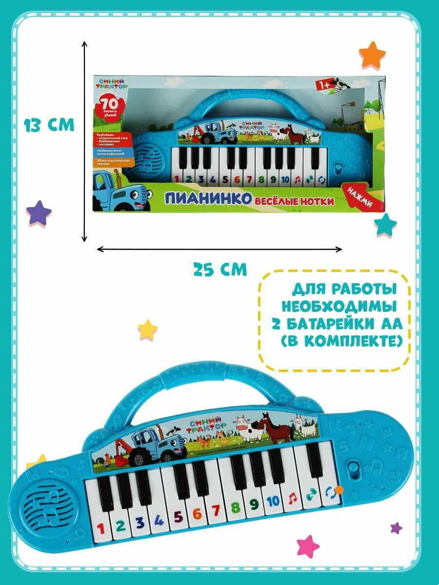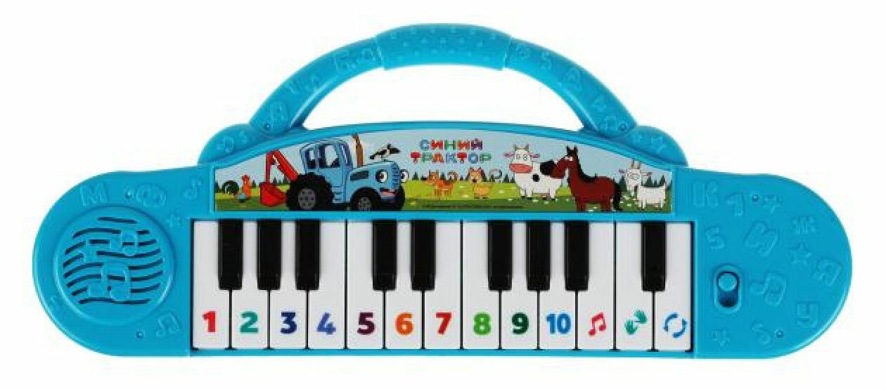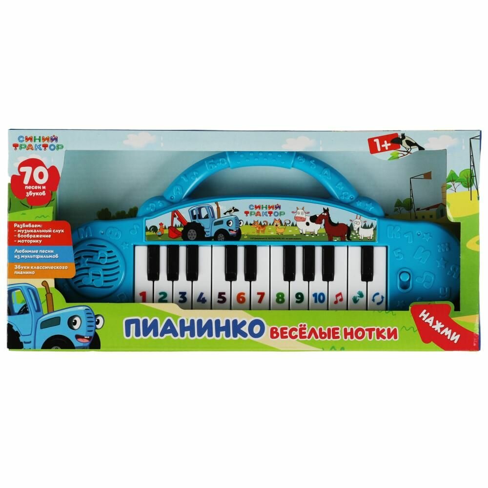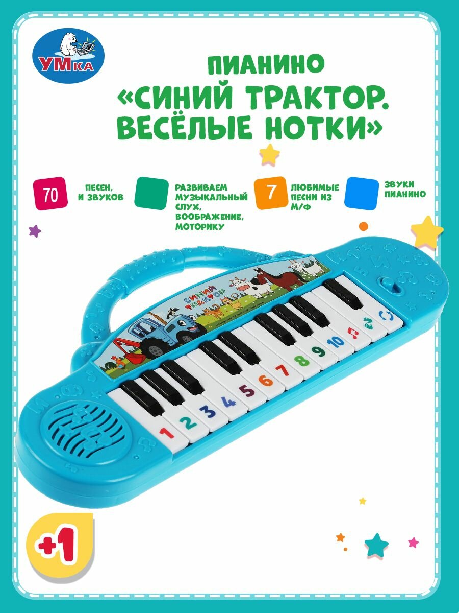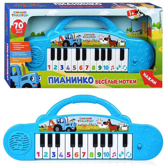 Музыкальное электропианино Синий трактор. Весёлые нотки непременно понравится маленькому поклоннику мультсериала про приключения весёлого трактора и будет способствовать развитию его творческих способностей: 70 песен и звуков, классическое пианино. Ребёнок с удовольствием будет нажимать на клавиши пианино и слушать весёлые песенки из любимого мультфильма. В увлекательной игровой форме малыш легко выучит цифры. Кроме того, с этой игрушкой можно играть и как с пианино. Игра с электропианино развивает: слуховые навыки и музыкальный слух, координацию движений, визуальное восприятие, мелкую моторику.
