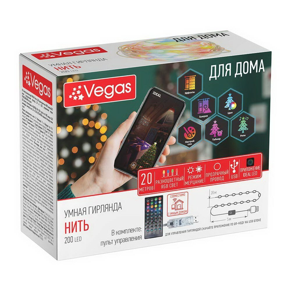 20м. Электрогирлянда УМНАЯ Нить Vegas 200 RBG USB управление через приложение и пульт (55191)