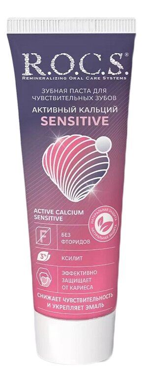 Паста кремового цвета с легким мятным ароматом.Зубная паста R.O.C.S. Активный кальций Sensitive содержит запатентованный мультиминеральный комплекс, усиленный ионами калия. Такой набор активных компонентов обеспечивает двойной механизм снижения чувствительности зубов:Биодоступный кальций восстанавливает минерализацию эмали, повышая ее устойчивость к раздражителям.Хлорид калия снижает возбудимость нервных окончаний в дентинных канальцах.Cнижает чувствительность зубов.Эффективно очищает зубы.Повышает минерализующий потенциал слюны.Восстанавливает естественный минеральный состав зубов.Повышает кислотоустойчивость и кариесрезистентность эмали.Защищает зубы в области контакта с пломбой.Способствует профилактике вторичного кариеса.АКТИВНЫЕ ИНГРЕДИЕНТЫ:Глицерофосфат кальция (источник ионов кальция и неорганического фосфата) + хлорид магния (кофермент щелочной фосфатазы) + силикат натрия (катализатор осаждения кальция и фосфата в форме гидроксиапатита) активно реминерализуют эмаль.Хлорид калия – безопасный десенситайзер. Ионы калия, накапливаясь в дентинных канальцах, вызывают деполяризацию мембраны нервного окончания, блокируя передачу нервного импульса, и тем самым уменьшая боль в ответ на термические и механических раздражители.Ксилит 3% повышает реминерализующий потенциал комплекса, подавляет активность кариесогенных бактерий и некоторых пародонтопатогенов, препятствует адгезии грибов рода Candida.ПРИМЕНЕНИЕ:Применять дважды в день (утром и вечером). Продолжительность чистки зубов 2-3 минуты. Для обеспечения более выраженного эффекта рекомендуется сплюнуть излишки зубной пасты, не ополаскивать рот и воздержаться от приема пищи и напитков в течение 30-40 минут.Не имеет ограничений по продолжительности использования.