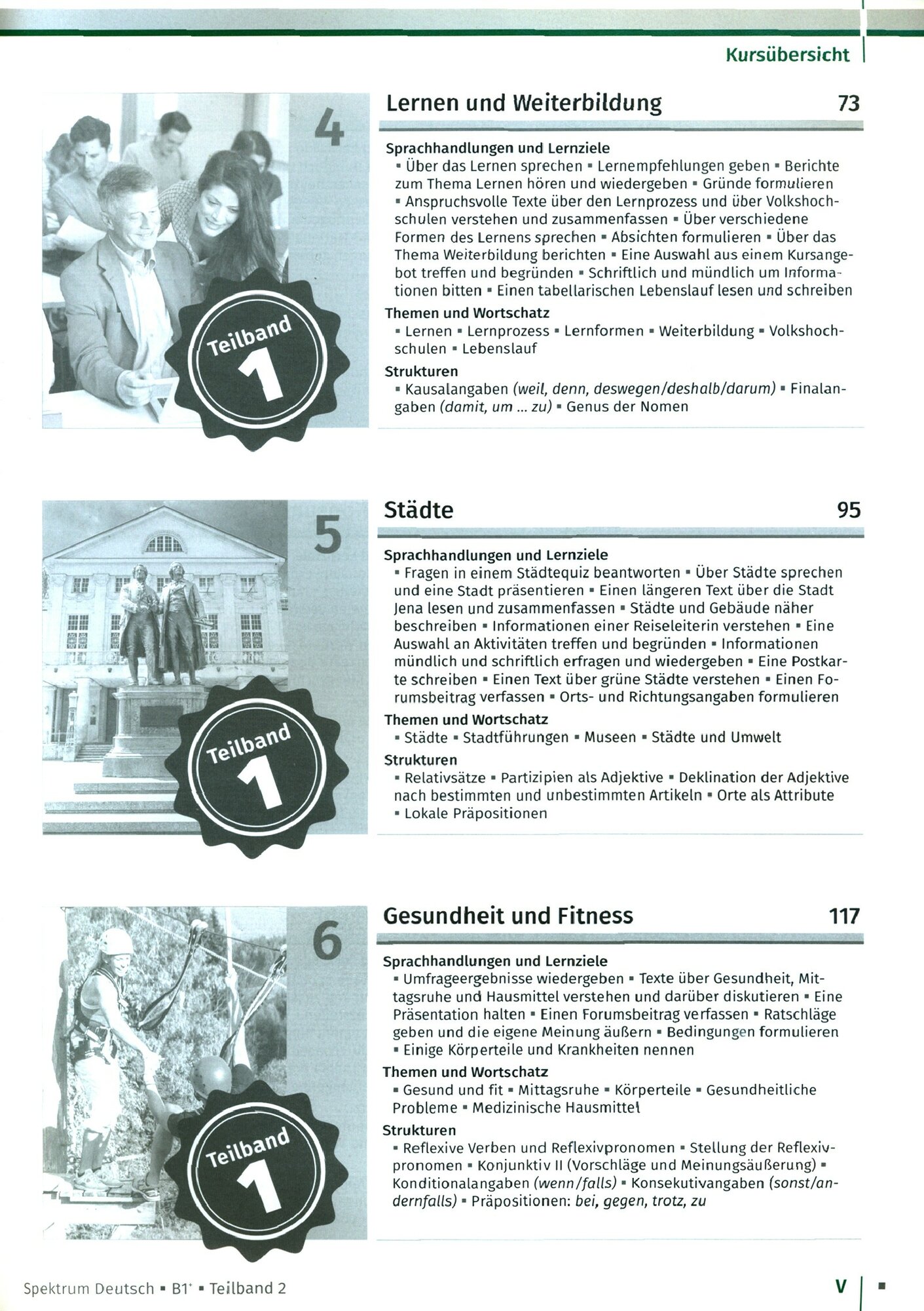 Spektrum Deutsch B1+ ist ein modernes und kommunikatives Lehrwerk, das an Spektrum Deutsch A2+ methodisch und inhaltlich anschlie?t. Es richtet sich an motivierte erwachsene Lerner, die zugig erkennbare Erfolge beim Erlernen des Deutschen erzielen mochten. Das Lehrwerk beinhaltet fur Alltag, Beruf und Studium besonders relevanten Wortschatz und wesentliche sprachliche Strukturen, interessante Themen und alltagsnahe Dialoge und Texte. Spektrum Deutsch B1+ integriert Kurs- und Arbeitsbuch in einem Band. Es ist inhaltsgleich sowohl in zwei Teilbanden als auch als Gesamtband erhaltlich. Die Teilbande bestehen aus jeweils 6 Kapiteln: Teilband 1 - Kapitel 1 bis 6; Teilband 2 - Kapitel 7 bis 12. Jeder Teilband enthalt einen Anhang mit den Losungen zu den Ubungen. Teilband 2 beinhaltet au?erdem einen Vorbereitungstest auf die Sprachprufung und eine zusammenfassende Ubersicht der behandelten Strukturen. Spektrum Deutsch B1+ beinhaltet zahlreichen Ubungen zur Schulung des Horverstehens. Die hierfur benotigten Audiodateien konnen mit unserer kostenlosen Audio-App offline auf dem Mobilgerat gehort werden. Daneben stehen die Audiodateien auch online bereit. Die Reihe Spektrum Deutsch entspricht mit seiner Fulle von Text- und Ubungsangeboten den sprachlichen und intellektuellen Anforderungen erwachsener Lerner im In- und Ausland. Das bewahrte methodische Vorgehen der Autorinnen und der klare, transparente Aufbau unterstutzen zielgerichtetes und effektives Lernen. Die Lehrwerke orientieren sich an den Beschreibungen des Gemeinsamen Europaischen Referenzrahmens fur Sprachen. Das Plus im Titel verweist darauf, dass der Inhalt in einigen Bereichen (z.B. im Wortschatz oder bei der Verwendung sprachlicher Strukturen) etwas uber die im Referenzrahmen fur das jeweilige Sprachniveau enthaltenen Lernziele hinausgeht (deshalb A1+, A2+, B1+).