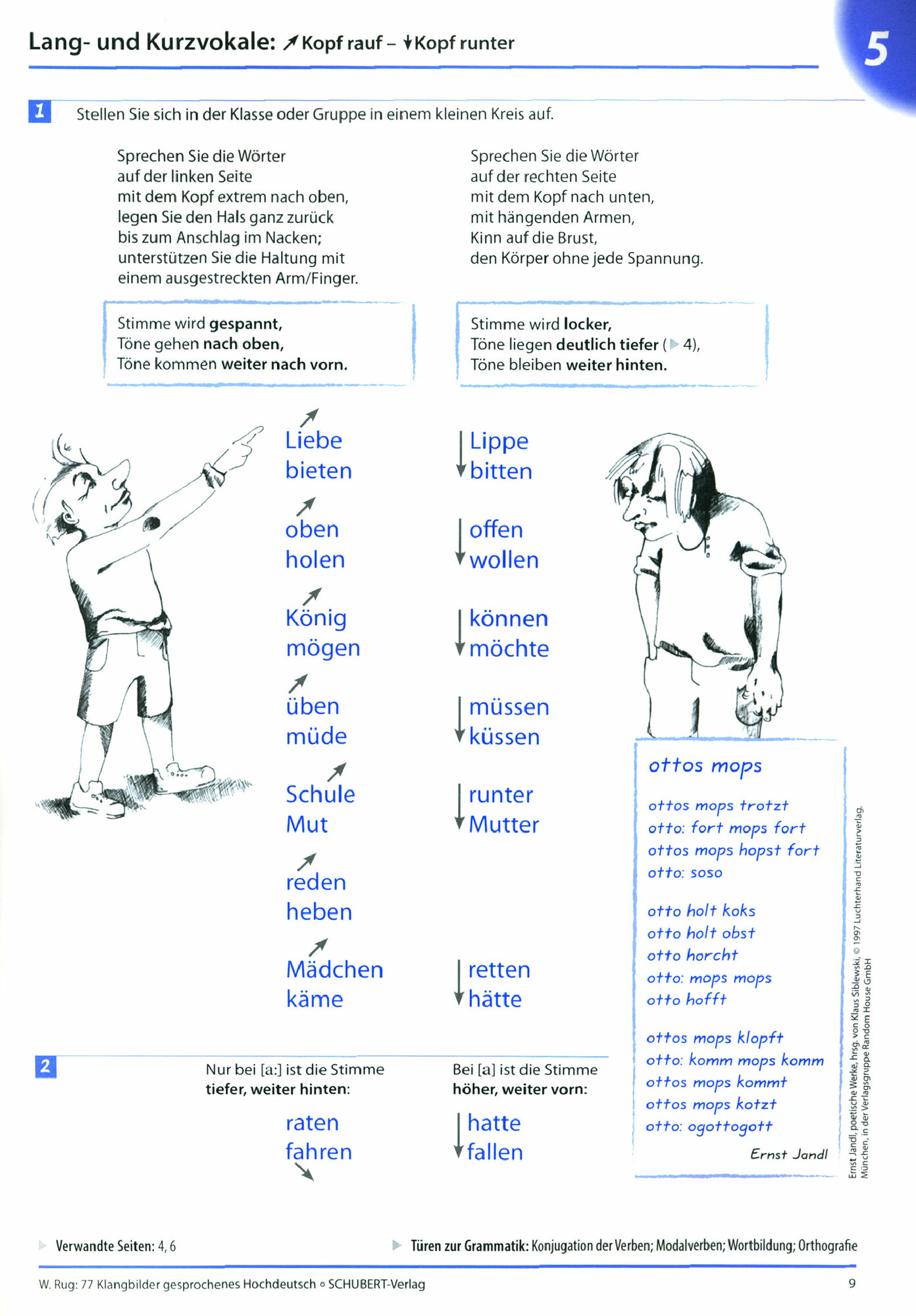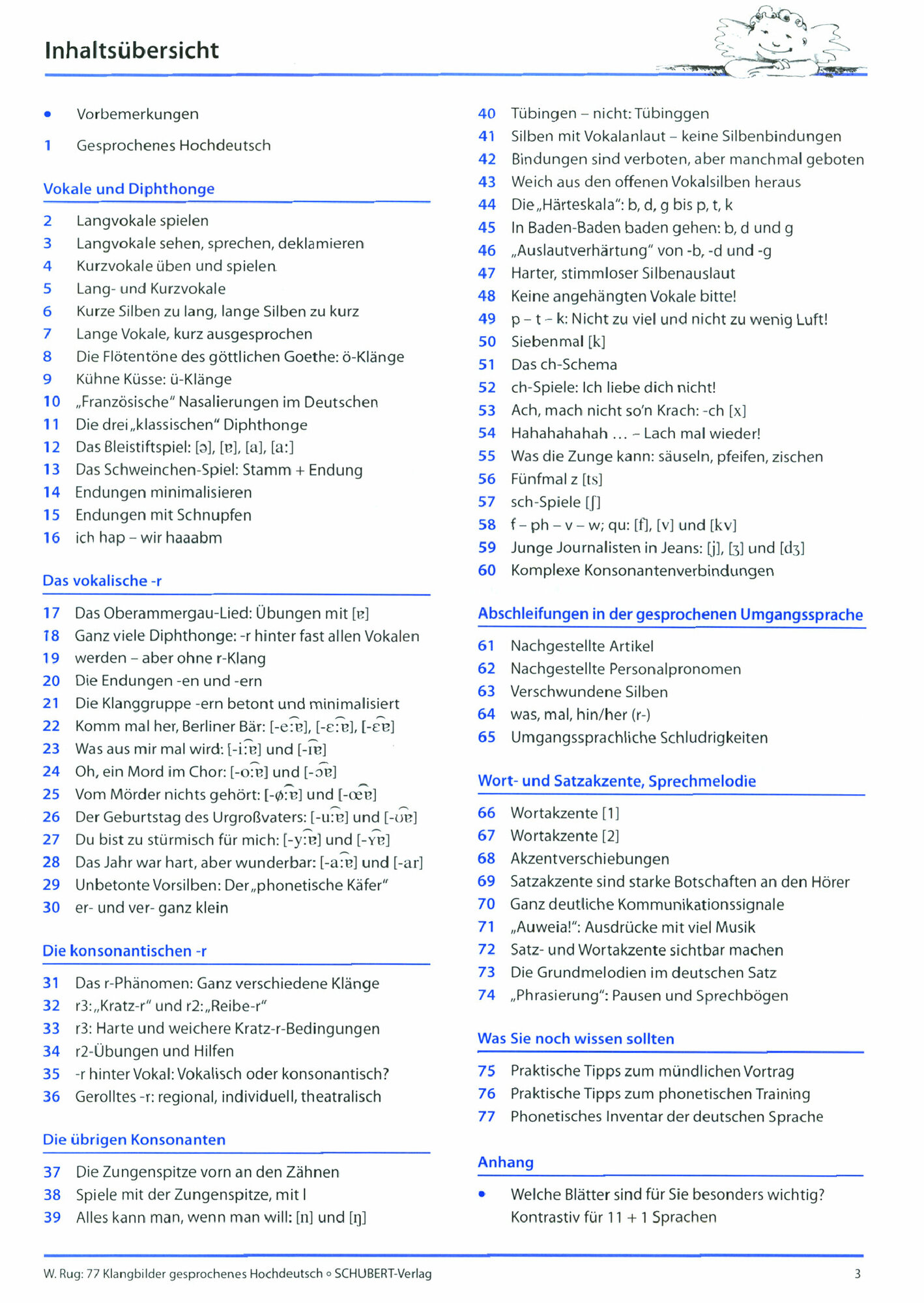 Jedes Blatt der 77 Klangbilder stellt ein spezifisches phonetisches Problem oder Thema in den Vordergrund und enthalt Horbeispiele, die dazu notigen Erklarungen, Bilder, Ubungen, Tipps und Tricks. Dabei ist die Darstellung an vielen Stellen kontrastiv ausgerichtet: Es werden Fehler und Hauptschwierigkeiten aufgegriffen, die von den Lernenden wichtiger internationaler Muttersprachen (Englisch, romanische Sprachen, slawische Sprachen, ostasiatische Sprachen u. a.) zu bewaltigen sind.