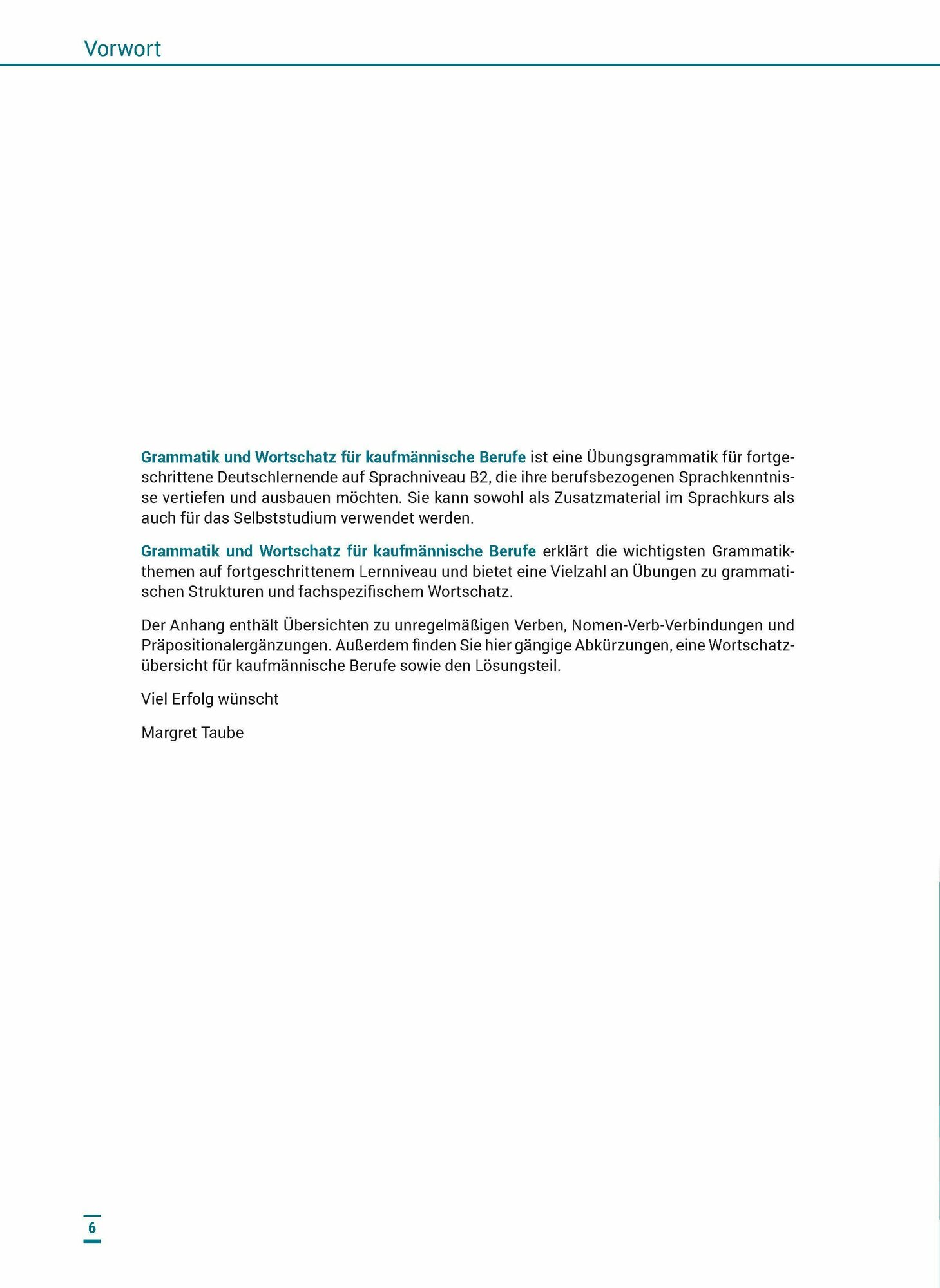 Grammatik und Wortschatz fur kaufmannische Berufe ist eine Ubungsgrammatik fur fortgeschrittene Deutschlernende auf Sprachniveau B2, die ihre berufsbezogenen Sprachkenntnisse vertiefen mochten. Sie kann sowohl als kursbegleitendes Zusatzmaterial als auch fur das Selbststudium verwendet werden.