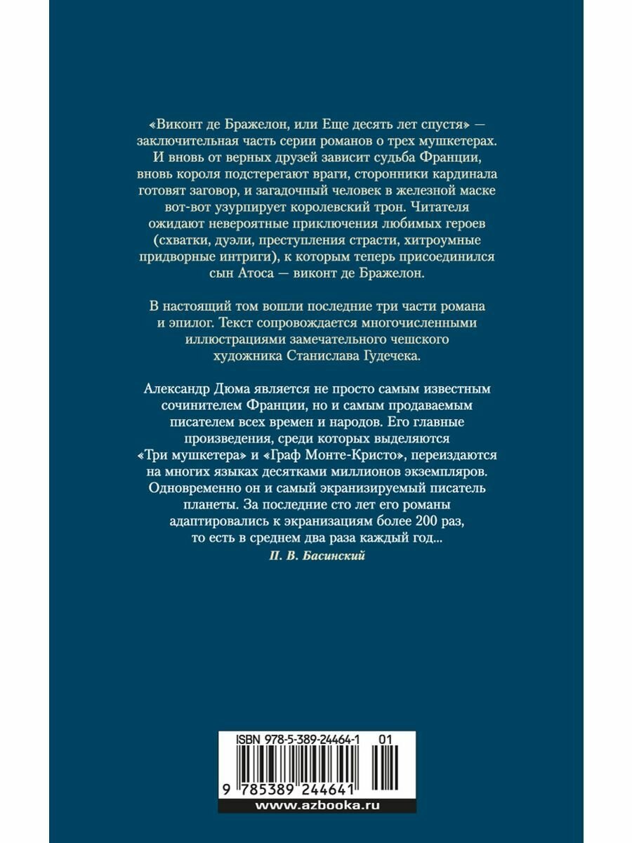 «Виконт де Бражелон, или Еще десять лет спустя» — заключительная часть серии романов о трех мушкетерах. И вновь от верных друзей зависит судьба Франции, вновь короля подстерегают враги, сторонники кардинала готовят заговор, и загадочный человек в железной маске вот-вот узурпирует королевский трон. Читателя ожидают невероятные приключения любимых героев (схватки, дуэли, преступления страсти, хитроумные придворные интриги), к которым теперь присоединился сын Атоса — виконт де Бражелон.